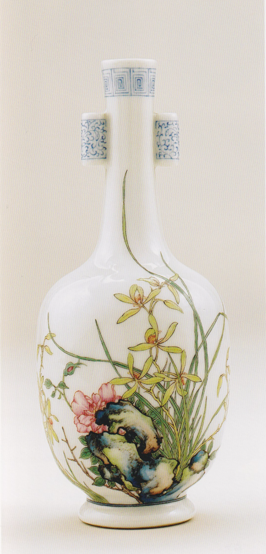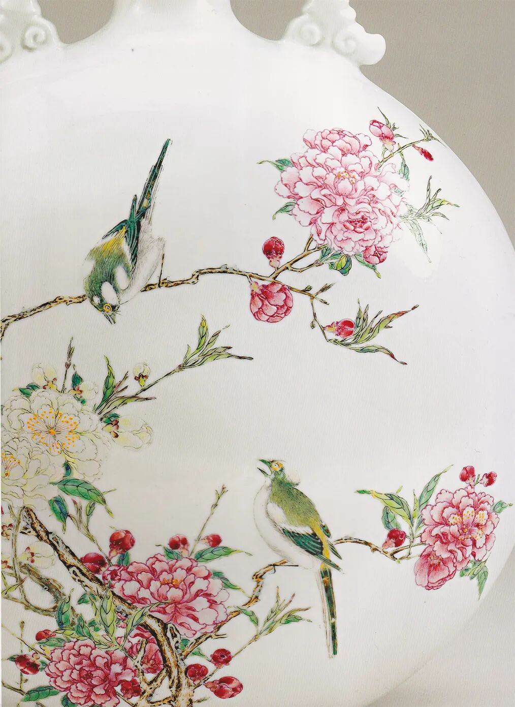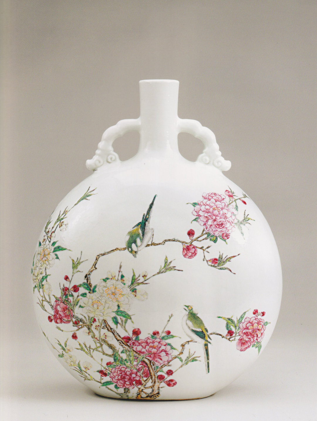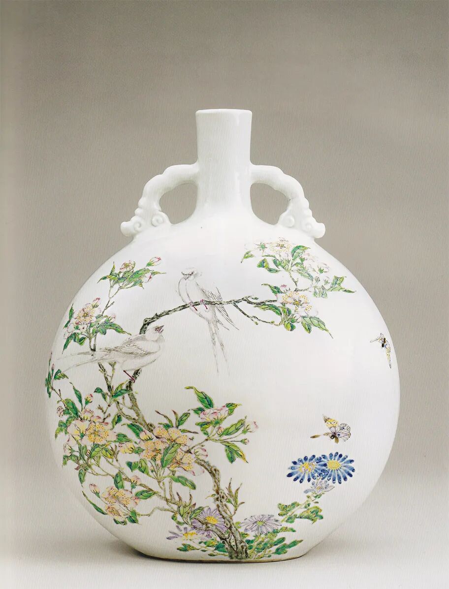 这件抱月瓶的造型为扁圆形瓶身,上接直筒状瓶颈,肩两侧上有祥云式耳,壶身两面饰有花鸟纹饰,其造型与主题花纹均源自明永乐时期(1403 ~ 1424年)的扁壶(参见图版28之扁壶),但此瓶所用的粉彩装饰技法,从釉彩到窑烧技巧,都是雍正时期的新创造。瓶身的一面描绘了两只白头翁停栖在盛开的白花与粉红色花枝上;另一面则描绘了一对白鸟停栖于另一种花枝上,并有一对蝴蝶飞舞于一丛紫蓝雉菊上,画面描绘得极为细致生动,反映出景德镇官窑奉旨监造的杰出品质。每一组高度写实的鲜花花瓣均精心过渡渲染,花叶也使用了最多达四种深浅不同的绿彩来绘写。同时几种新的彩料也开始使用,包括雏菊的釉上蓝彩代替了以前的釉下青花,鸟翅上的白彩,以及鸟喙、鸟腿上使用的褐彩。白头翁鸟寓意富贵白头。壶底带青花六字雍正年号款。