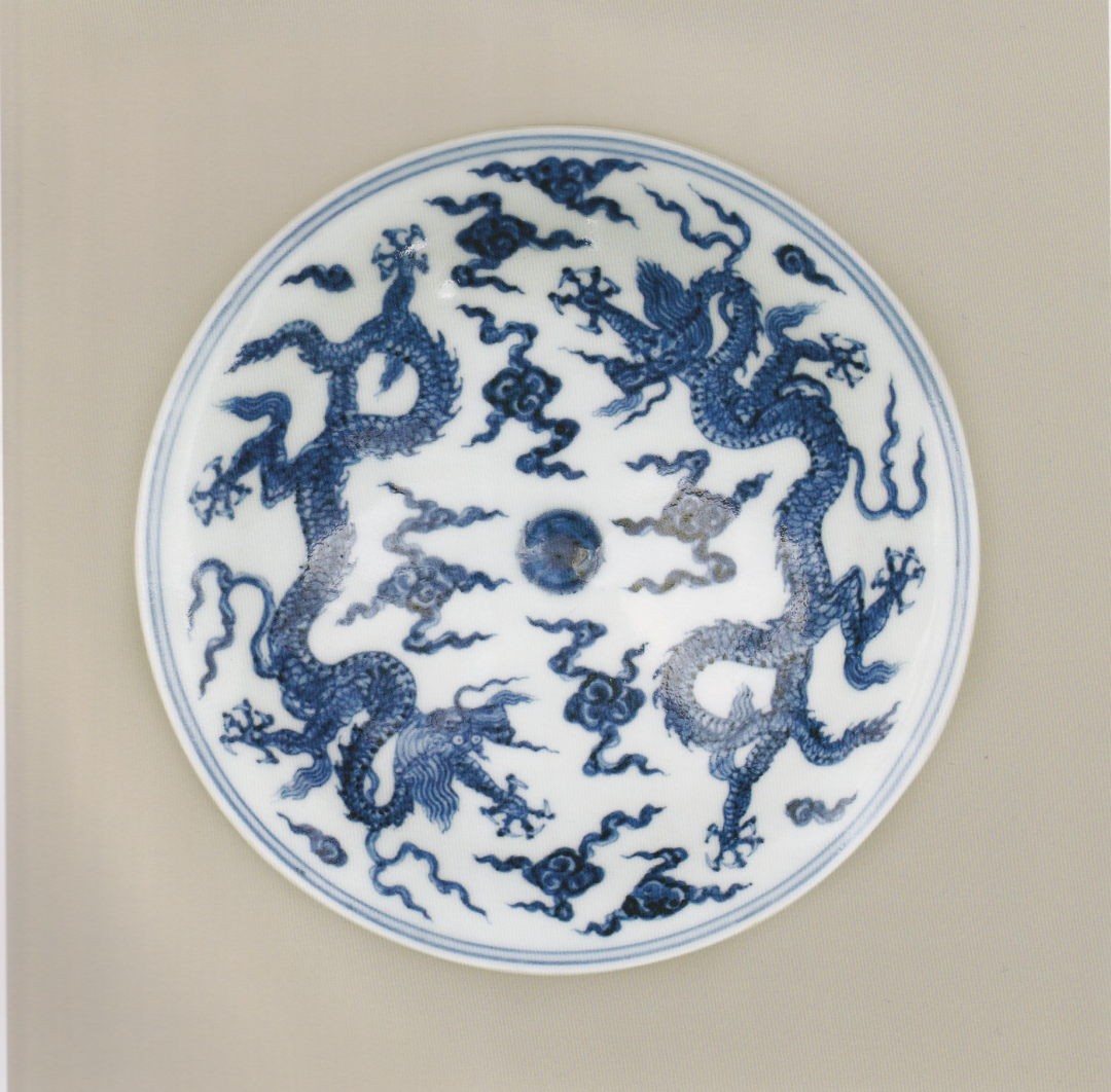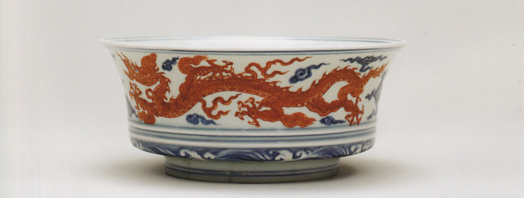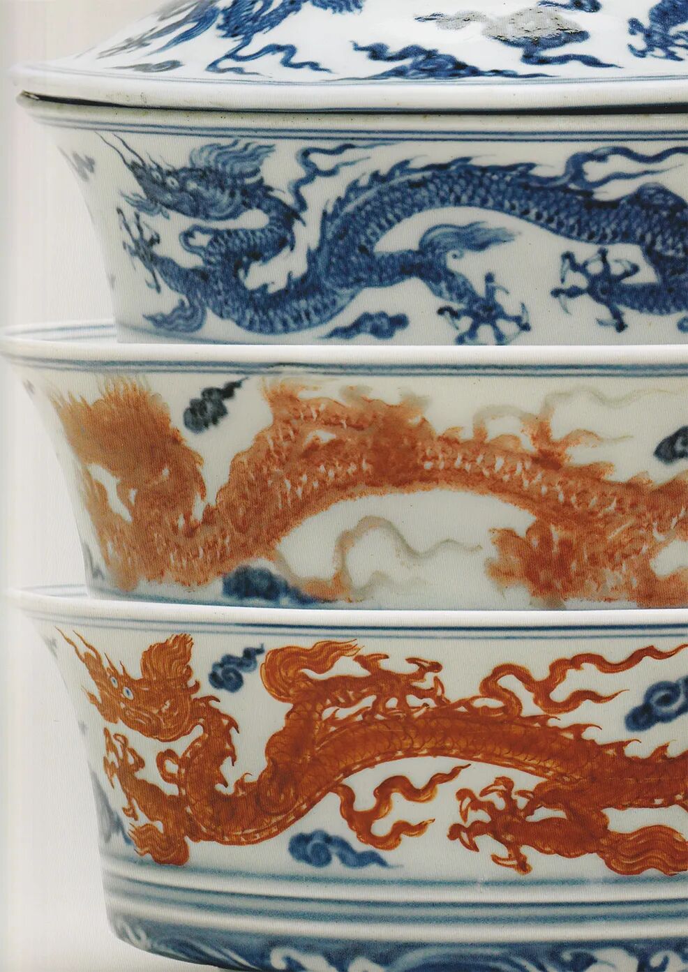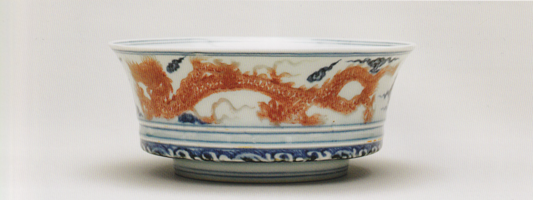 这三件折腹碗的造型是宣德时期始创的。画工们用了三种不同的技法来描绘这三件碗上的双龙戏珠纹,分别是:釉下铜红(釉里红)、釉下钻蓝(青花)及釉上铁红(矾红)。其中,铁红是在15世纪早期的作品中极其罕见的装饰方法。这种折腹碗原本都应配有相对应的微拱形碗盖,整体看起来像是一个盒子。三件碗内均带有六字双圈宣德年号款。虽然之前永乐朝瓷器上间或使用过四字年款,但至宣德朝才发展为标准的六字年号款,表明了此时皇室开始对官窑制造进行直接监督控制。