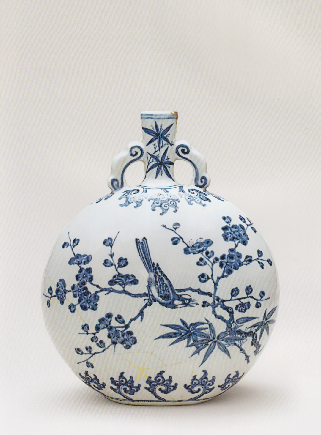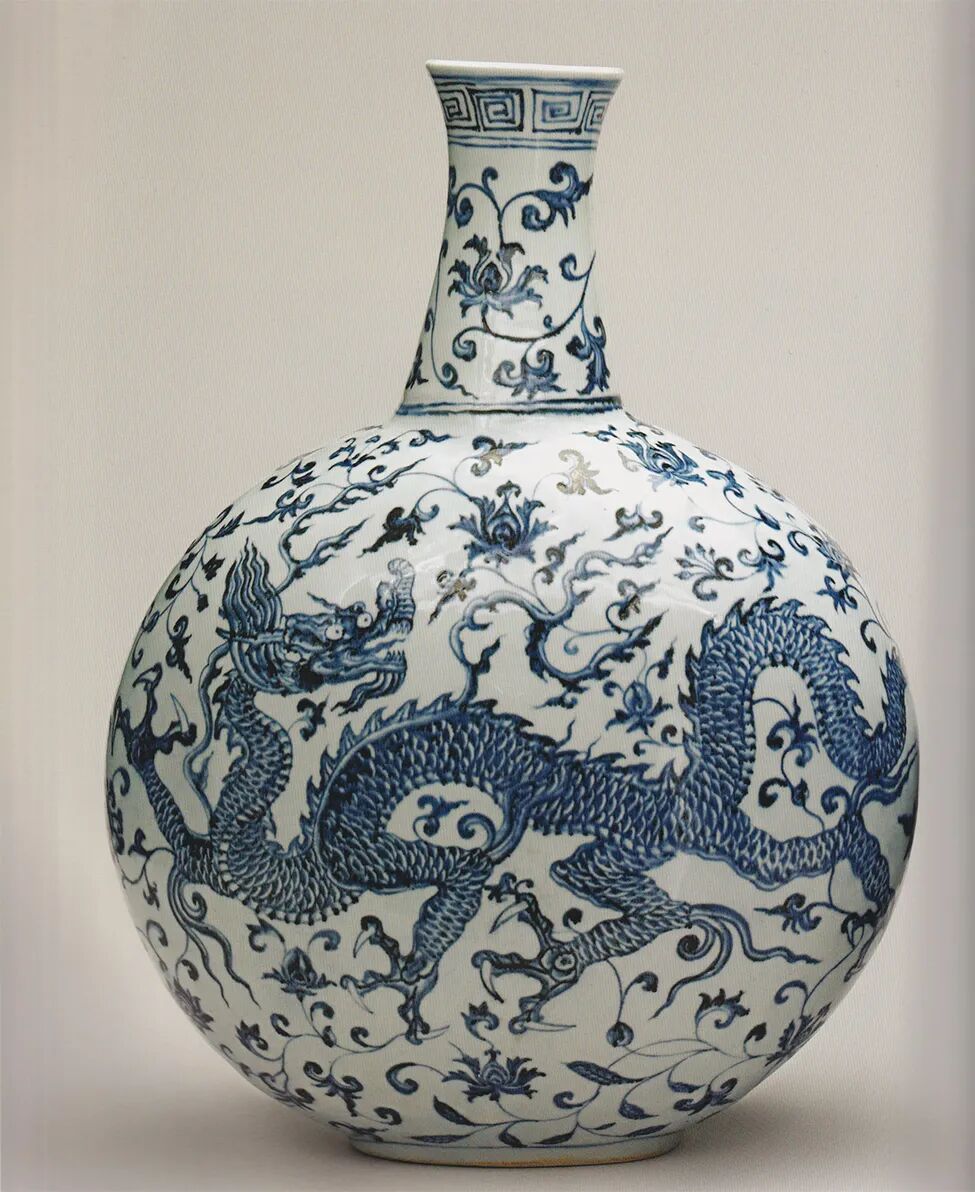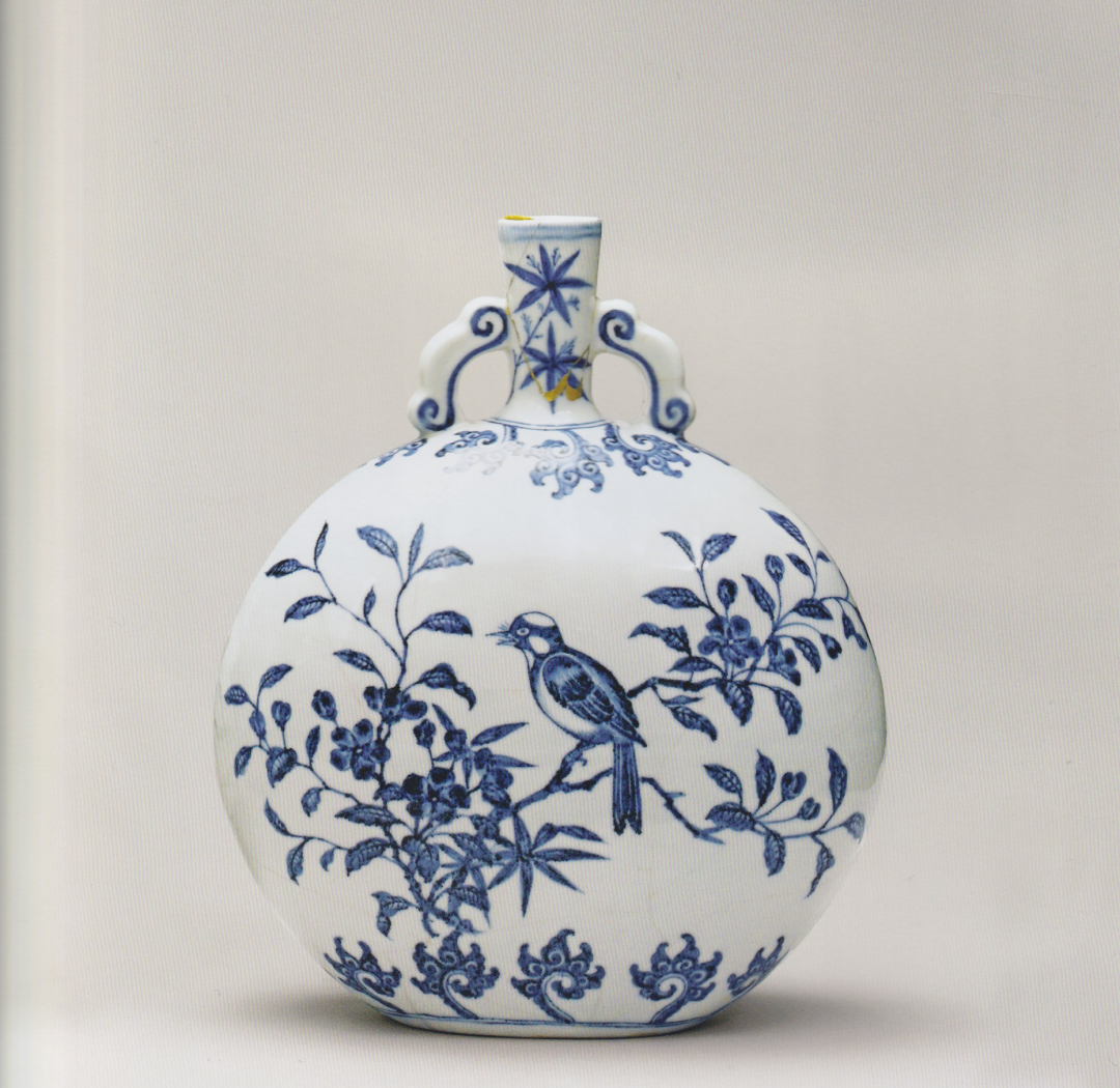 贸易商品被运往近东地区的国家,土耳其的托普卡帕宫博物馆与伊朗的阿尔达比尔神庙珍藏中都能发现同类的扁壶,可资佐证。明永乐时期,大量的江西人在朝廷供职,这也许是保持景德镇成为官窑瓷器主要生产供应地的原因之一。