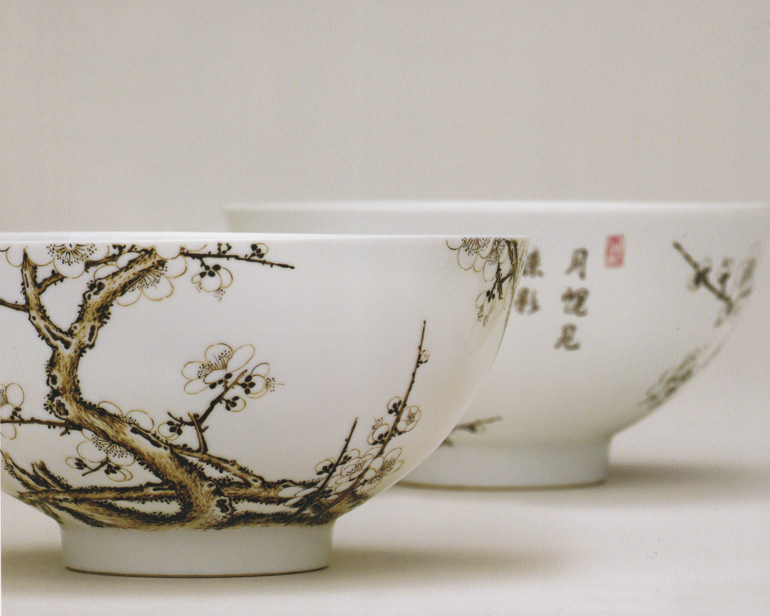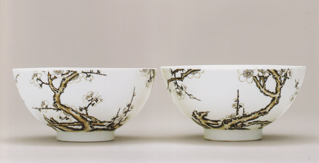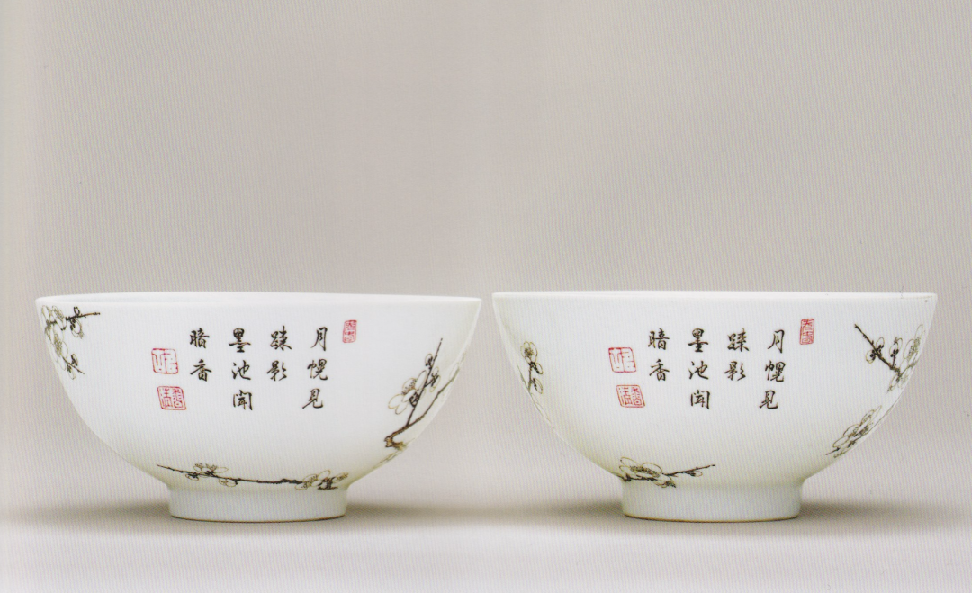 按照朝廷的旨意,这对碗以深浅不同的黑彩来描绘冬季盛开的梅花,并配有两句五言短诗及三枚褐色印章。大维德爵士当年从阿佛菜德·希皮斯里先生(AlfredE.Hippisley, 1842~ 1940年)处买下了这对碗。希皮斯里曾是英国海关驻中国的官员,他曾在1900年翻译过这首诗:“月幌见踈影,墨池闻暗香。”诗首有一枚方章,曰“先春”;诗末则有两枚印章,曰“古月”和“清香”。这首18世纪短诗的灵感可能来自北宋初年著名隐逸诗人林逋(965 - 1026年)的名句。林逋生性淡泊名利,经常将诗作随手丢弃。纯以黑彩来描绘盛放的梅花,使人直接联想到同时期传统的清代水墨画。