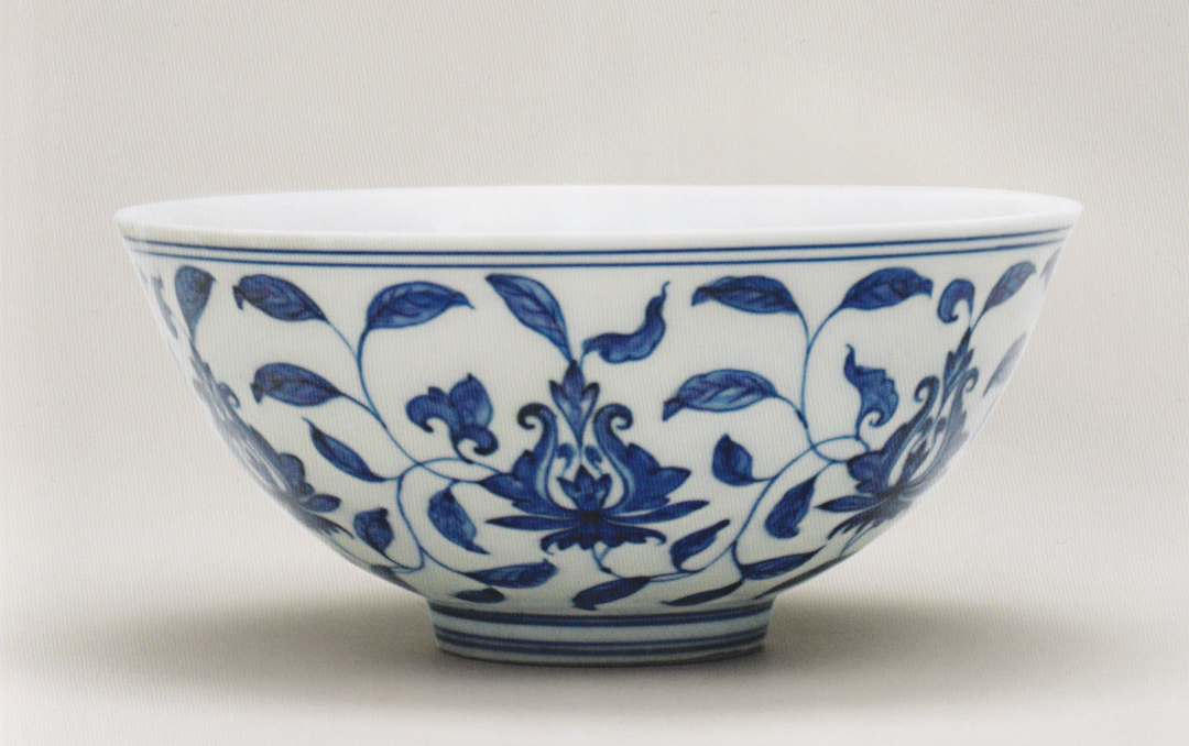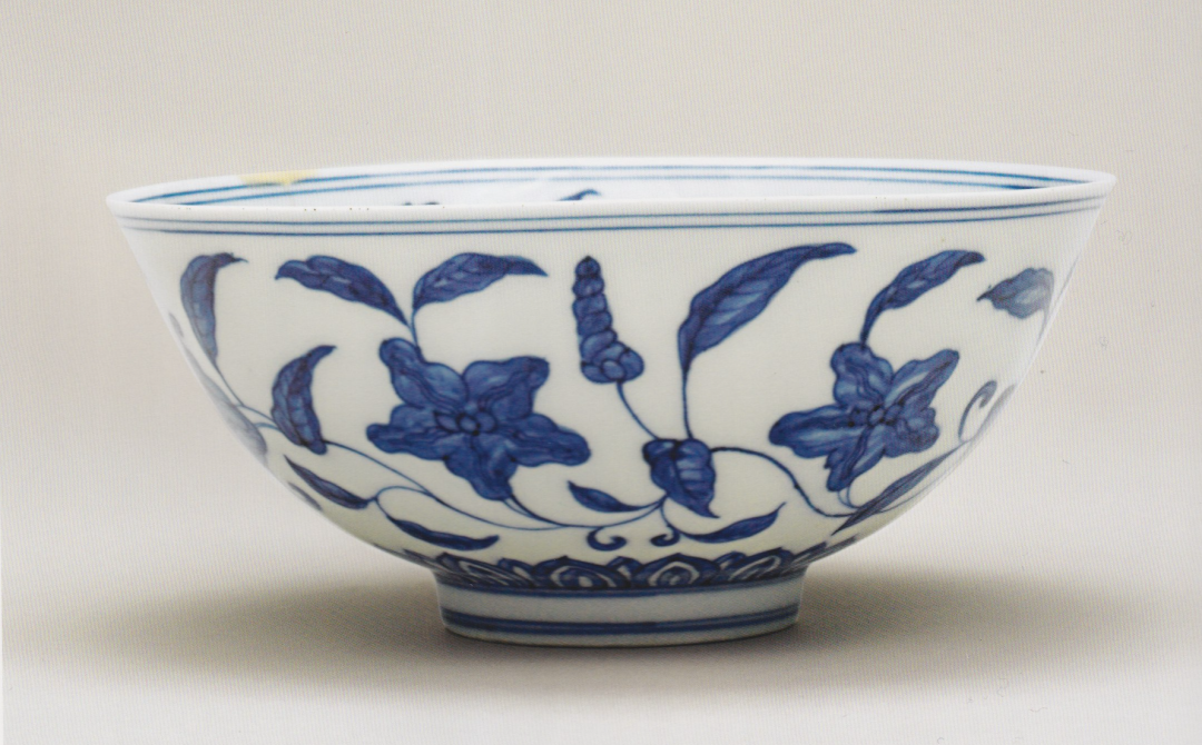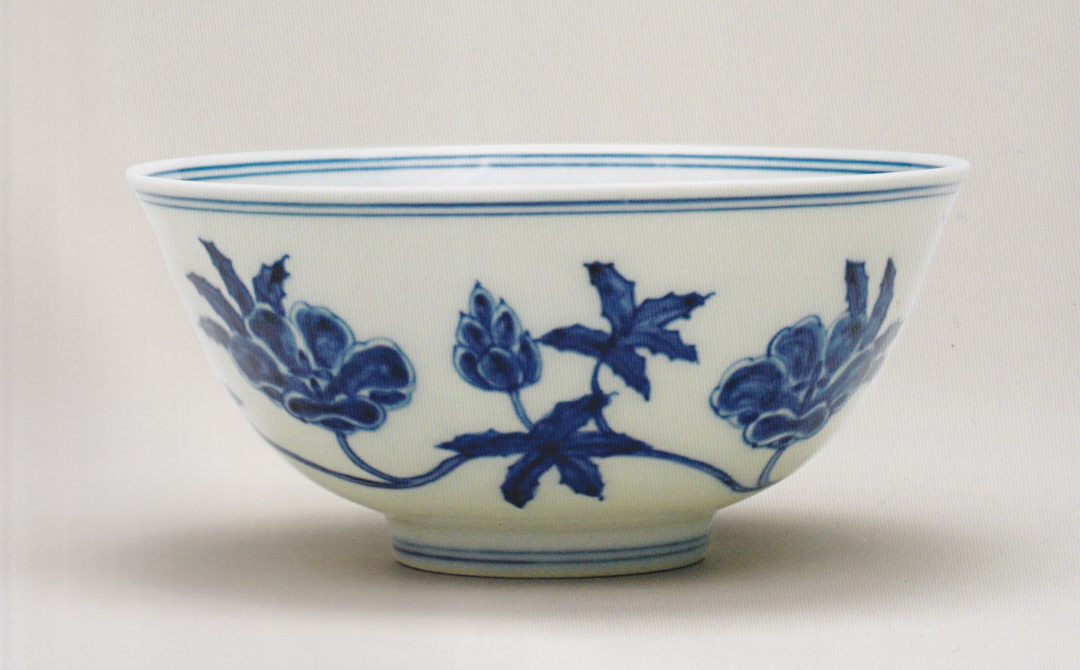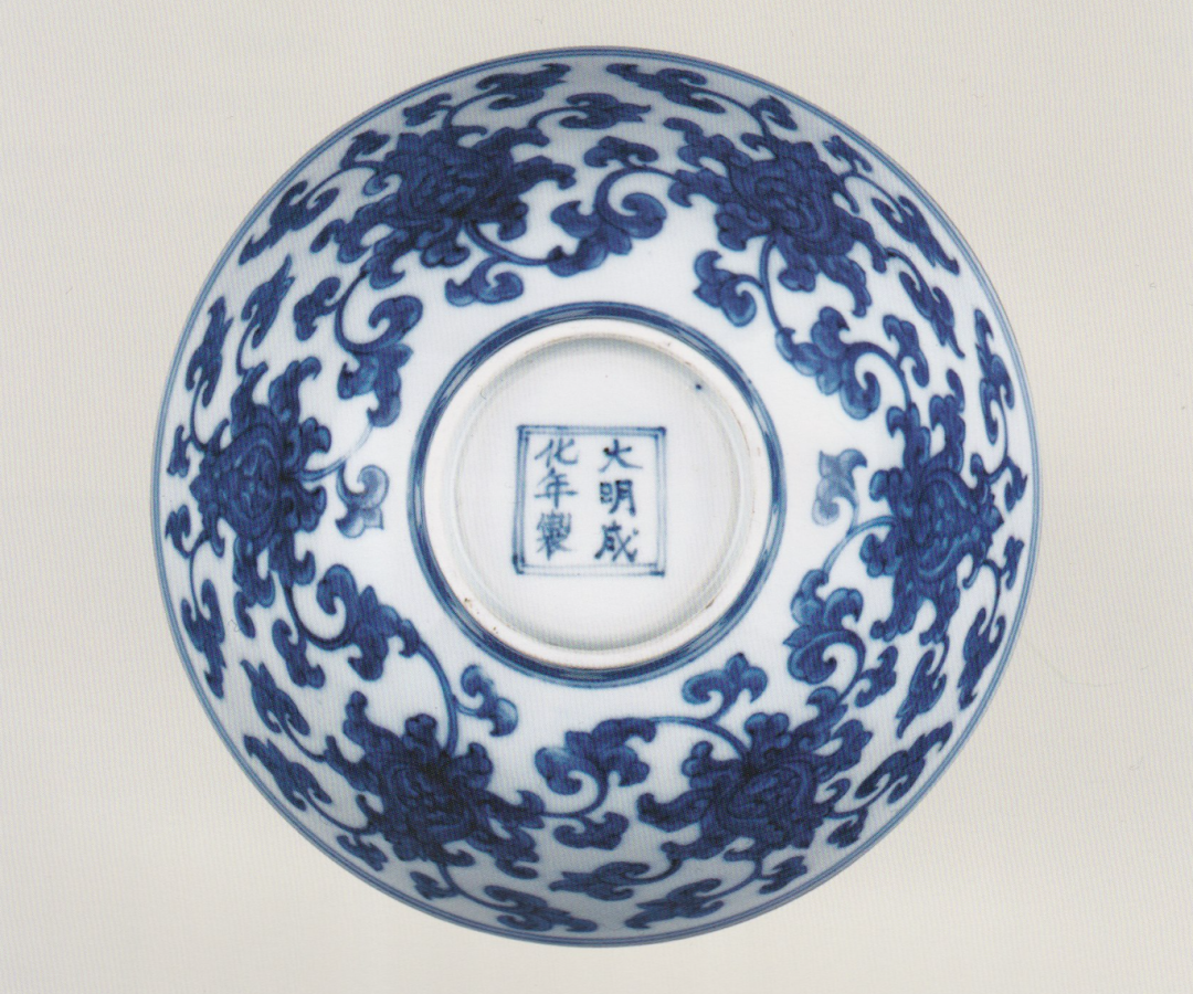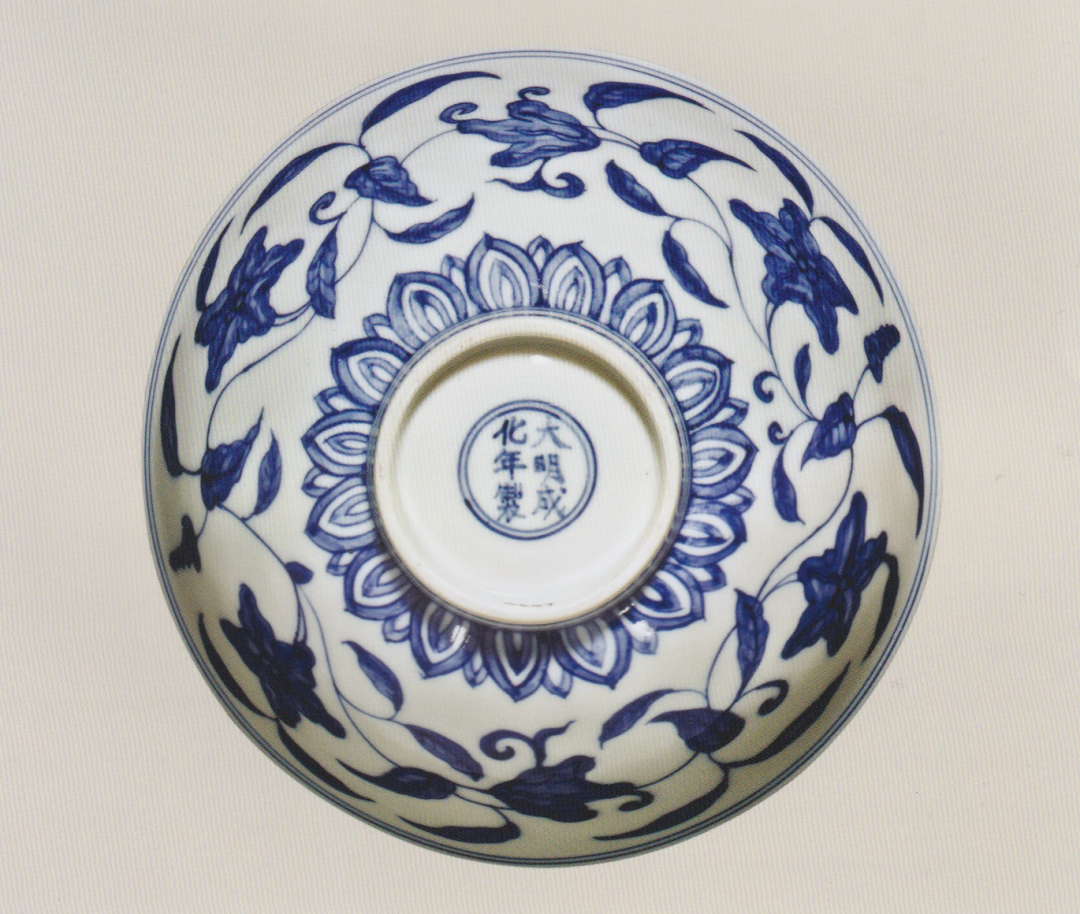 明成化时期,景德镇御窑厂官窑瓷器的生产数量相比宣德时期(1426 ~ 1435年)要少得多。尽管成化一朝历时几乎是宣德期的两倍,但御窑厂成化地层出土的瓷片数量却不到宣德的一半。此时瓷器的造型与装饰方法不如前朝丰富,但成化瓷创生出一种精致、纯净的风格,装饰画面倾向于大面积的留白,以充分显露出瓷胎的洁白。这类带成化年号款的青花瓷,如这七件作品,首先被汉学家及曾任大英博物馆亚洲部主任的白兰士敦先生(Archibald Brankston,1909 ~ 1941年)在他于1938年出版的开创性著作《景德镇明代早期瓷器 》(Early Ming Wares of Chingtechen)一书中称为“宫碗”。这种宫碗的青花纹样包括有缠枝百合花、锦葵、莲花、栀子花以及瓜藤纹等。