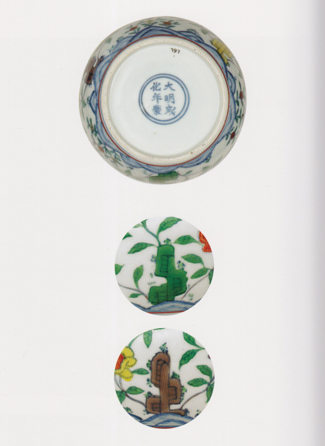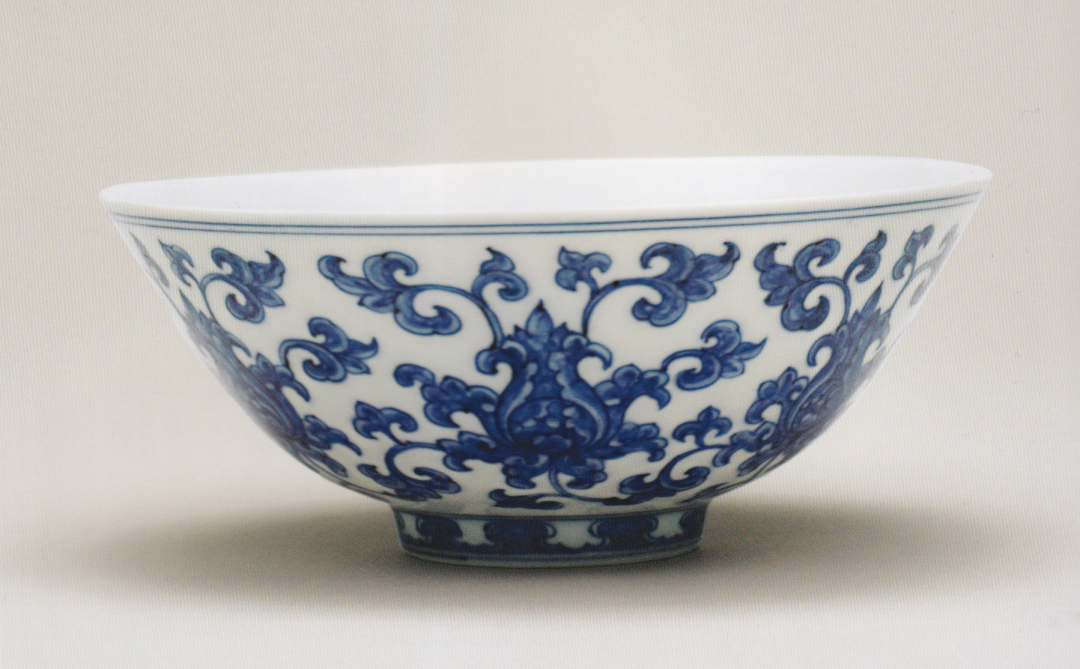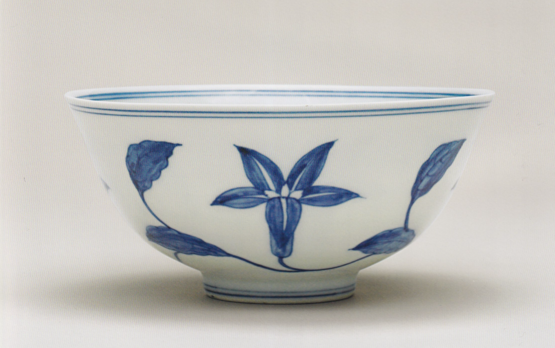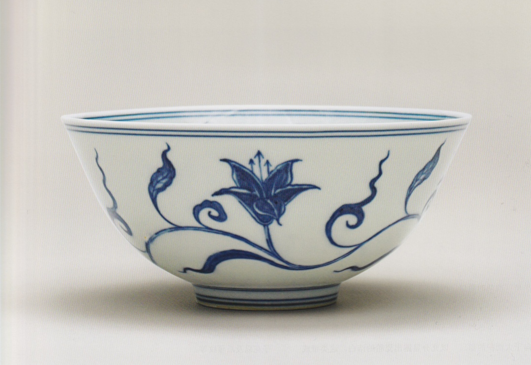 明成化时期,景德镇御窑厂官窑瓷器的生产数量相比宣德时期(1426 ~ 1435年)要少得多。尽管成化一朝历时几乎是宣德期的两倍,但御窑厂成化地层出土的瓷片数量却不到宣德的一半。此时瓷器的造型与装饰方法不如前朝丰富,但成化瓷创生出一种精致、纯净的风格,装饰画面倾向于大面积的留白,以充分显露出瓷胎的洁白。这类带成化年号款的青花瓷,如这七件作品,首先被汉学家及曾任大英博物馆亚洲部主任的白兰士敦先生(Archibald Brankston,1909 ~ 1941年)在他于1938年出版的开创性著作《景德镇明代早期瓷器 》(Early Ming Wares of Chingtechen)一书中称为“宫碗”。这种宫碗的青花纹样包括有缠枝百合花、锦葵、莲花、栀子花以及瓜藤纹等。