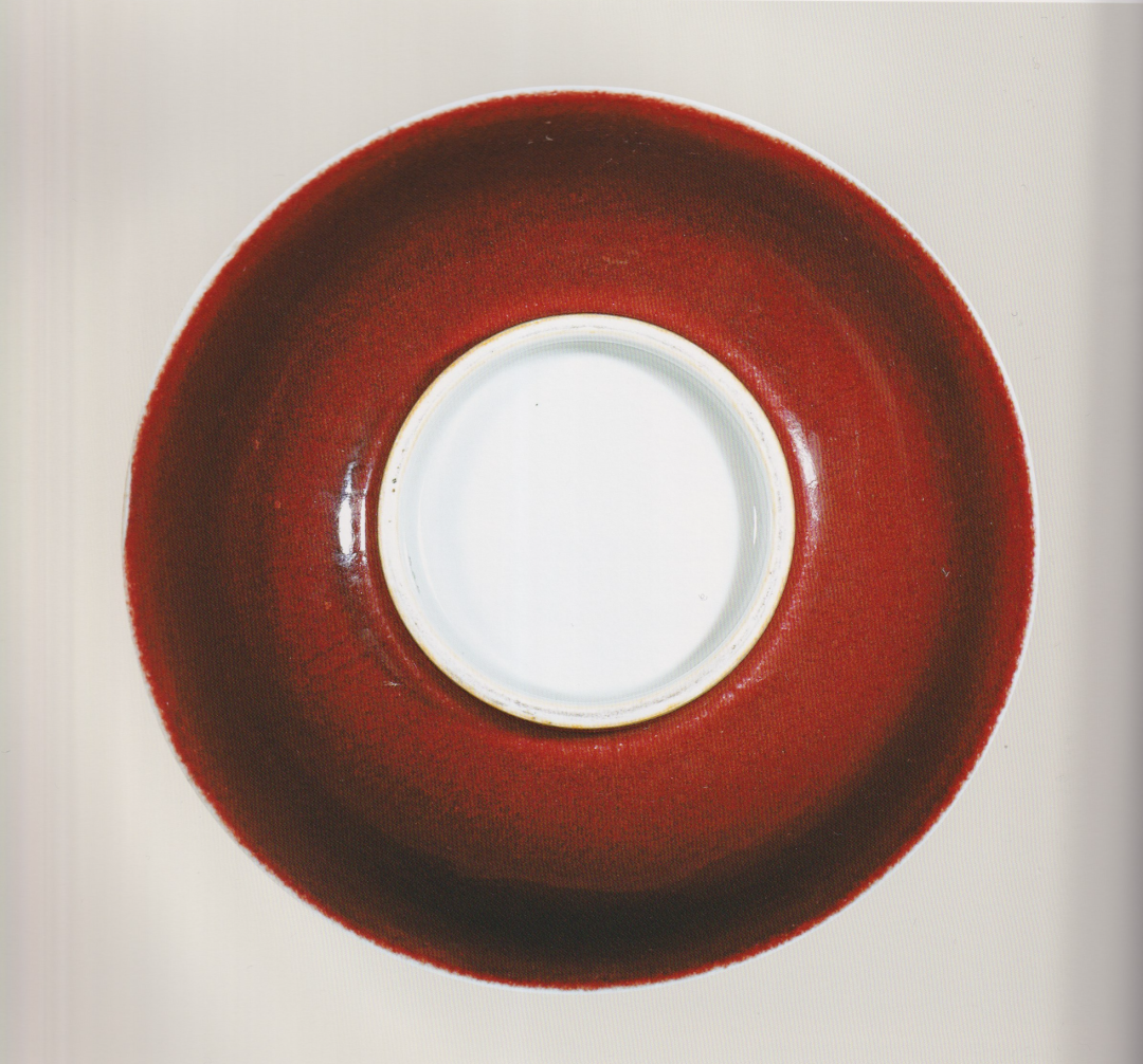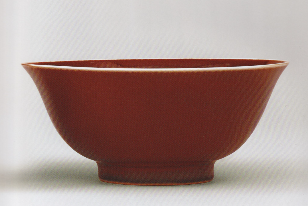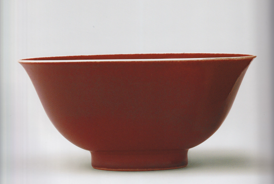 明永乐与宣德时期制作的祭红,即鲜红或深红色的单色铜红釉瓷器,代表了景德镇制瓷技术成就的巅峰。在15世纪早期这些奉皇帝旨意为祭祀仪式之用而烧造的瓷器,享有高于其他瓷器品种的地位。然而,烧制这种卓越的高温红釉的技术从15世纪中期开始却消失了,直至17世纪晚期至18世纪早期才得以恢复。这两件碗的口沿有“灯草边”效果,显示出纯白的胎骨。尺寸稍大的永乐碗在足胫上刻有一圈莲瓣纹,形制与洪武时期的红釉碗相似,而另一件宣德碗则光素无纹。这种具有玻璃质感的红釉釉面满布微小的针眼孔,像皮肤表面的毛孔一样,釉色则带有粉质深度感,显示出带有丰富深浅层次的强烈红色调。