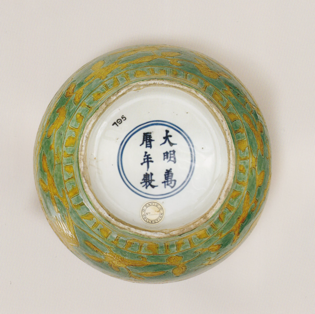 这件经两次入炉烧造的盘子展现出窑工们熟练的技术。首先,趁盘子的白坯未干透前,窑工在盘内壁上以暗花手法制作出五爪双龙赶珠纹,在盘心划刻出三朵祥云纹;接着在盘子底心以青花料写上六字双圈年号款后,通体内外施一层透明釉,入窑高温烧成。瓷盘烧好出窑后,窑工们再用釉刷在其外壁刷上低温孔雀蓝(或称松石绿)釉,放入低温炉中二次烧成。景德镇珠山明代御窑厂遗址曾出土过相同盘子的残片。暗花纹饰必须对着光线方能清楚显现。