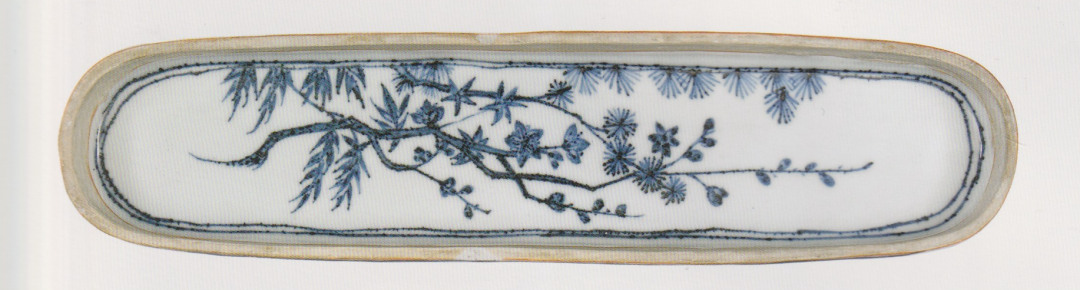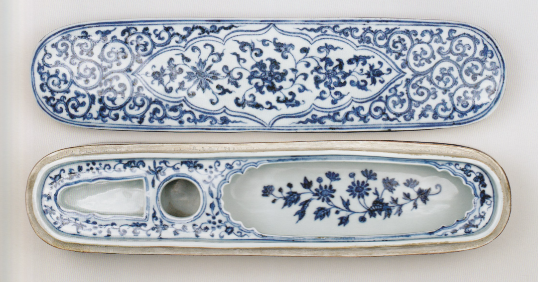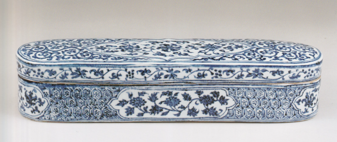 这件文具盒内部分为三个形状各异的挡格,可能分别用于放置笔、水或墨汁,以及吸墨线。盒盖里绘青花“岁寒三友”图(参见图版43)。有一件形制相同而纹饰有异的盖盒曾在1984年出土于景德镇珠山御窑厂遗址的永乐地层。永乐皇帝曾大力资助过当时明王朝对外的海上贸易与探险活动。著名的郑和将军(1371~1433年)就是奉永乐皇帝之命,前往东南亚、近东及非洲诸国,展开了多次海上外交与贸易的航程。中外交流将近东地区新奇独特的器物造型与装饰主题带到了明朝宫廷,并形成了一种新的流行艺术风尚。本件文具盒即是一例,其造型与繁密的绘画风格明显受较早期近东地区制作的金属镶嵌器启发而来,例如埃及或叙利亚曾生产一种铜文具盒,有些还带嵌银工艺,可资比较。