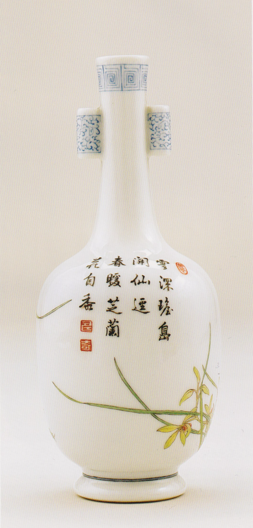 其次,瓶身上的珐琅彩装饰体现出宫廷瓷器画师杰出的技艺。瓶子一面绘湖石旁丛生的兰花和灵芝,一面配以两句七言诗句:“ 云深琼岛开仙径,春暖芝兰花自香。”诗首与诗末共有三枚印章,曰“郁心”、“寿”及“奇”。瓶底书蓝料四字“乾隆年制”楷书款。