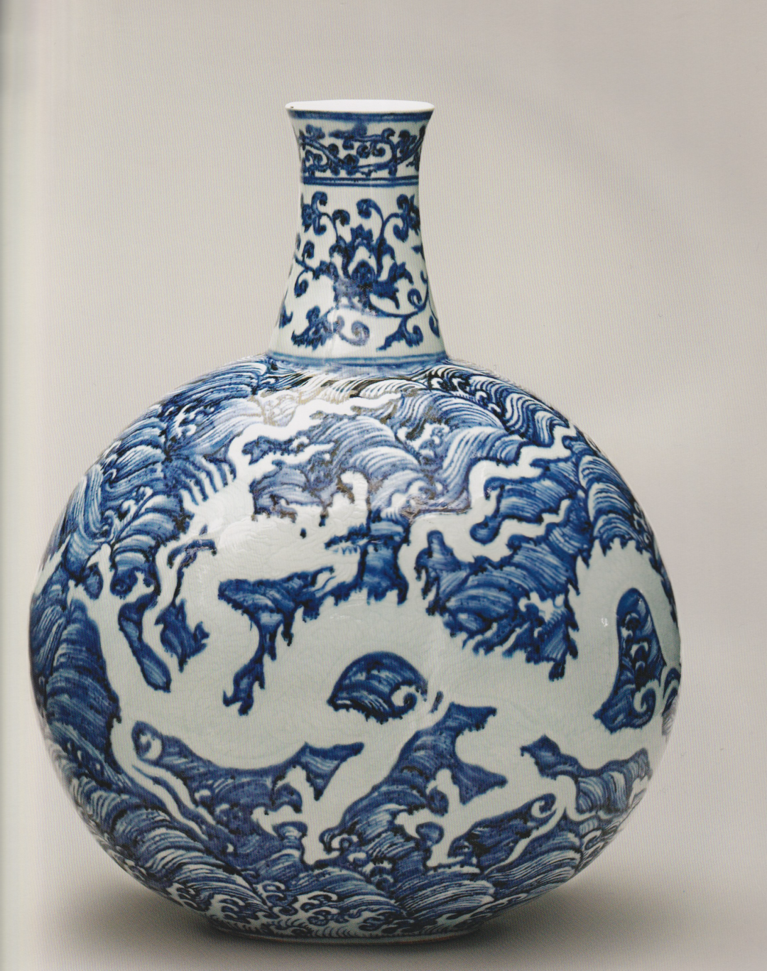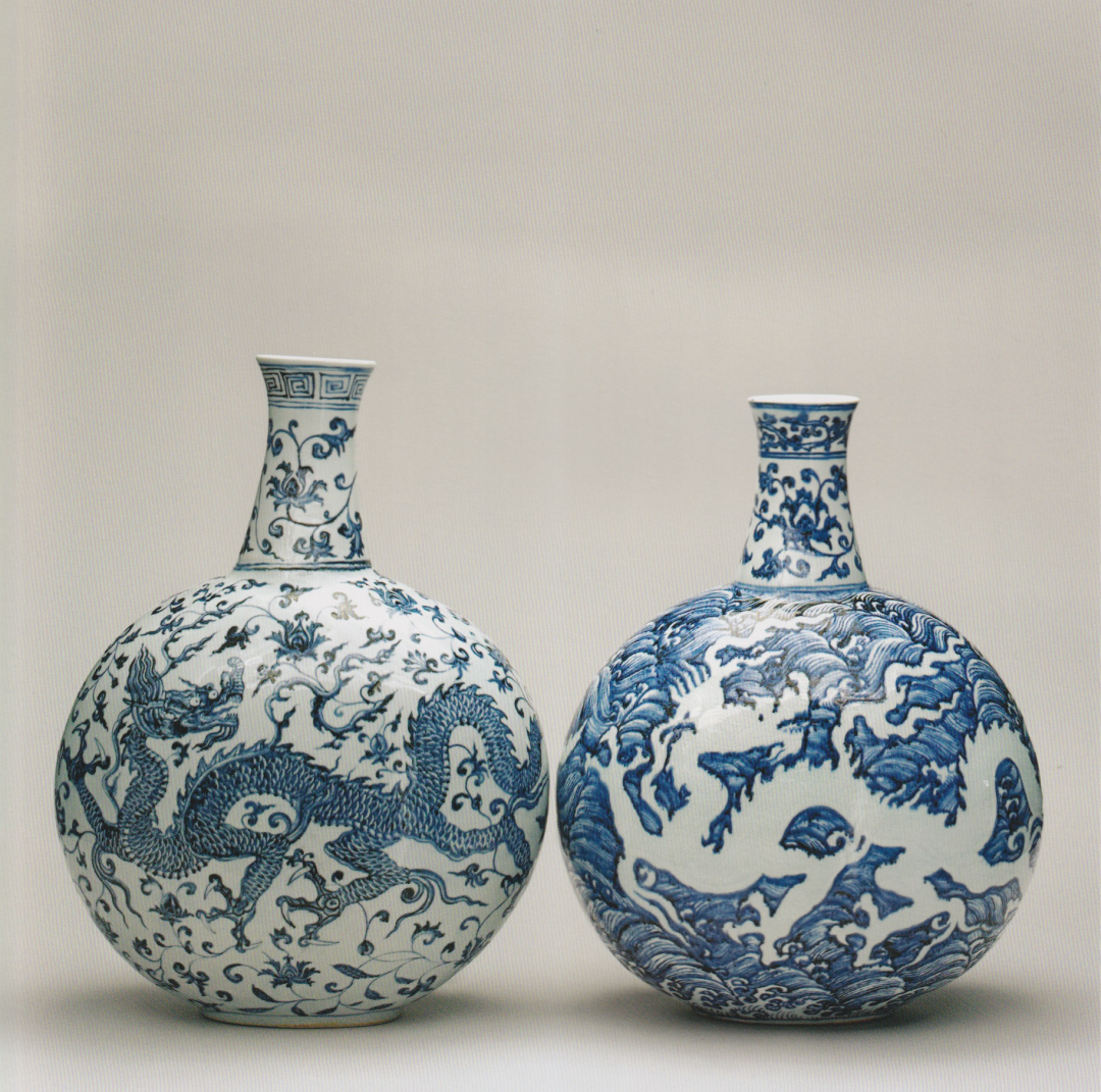 这两件扁壶的造型并非中国样式,而是源自近东地区的器物,可能是彩绘玻璃器皿。明永乐(1403~1424年)及宣德(1426~1435年)两朝设立在景德镇珠山的御窑厂均烧造过这种造型巨大呈球状、胎骨厚重、纹饰各异的扁壶。1994年,景德镇珠山东门头明代御窑厂遗址的永乐地层中,即出土过一件与此相同的扁壶,波浪上三爪龙细部刻划精细。这类扇壶可能被用作为官廷使用的酒器,同时也作为