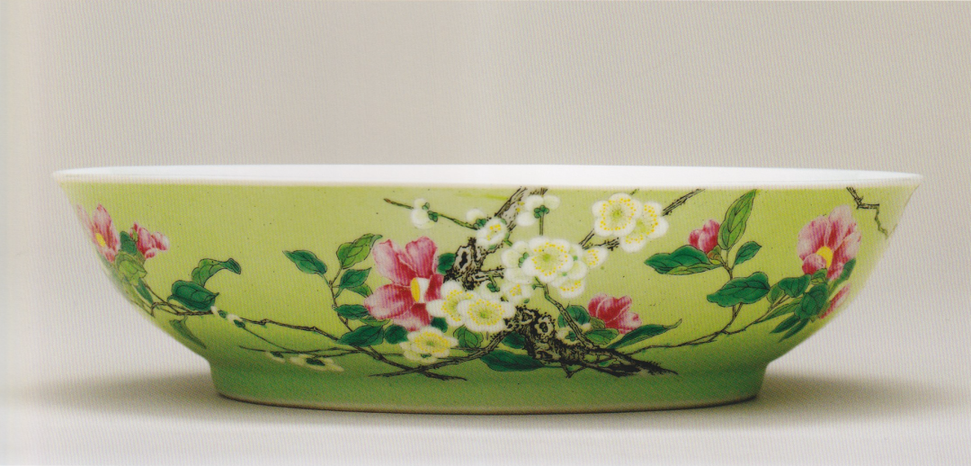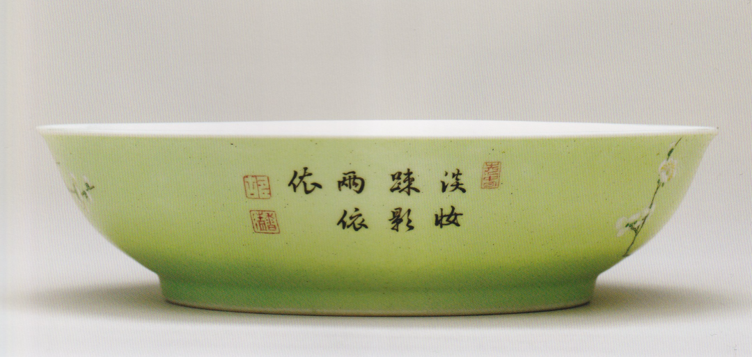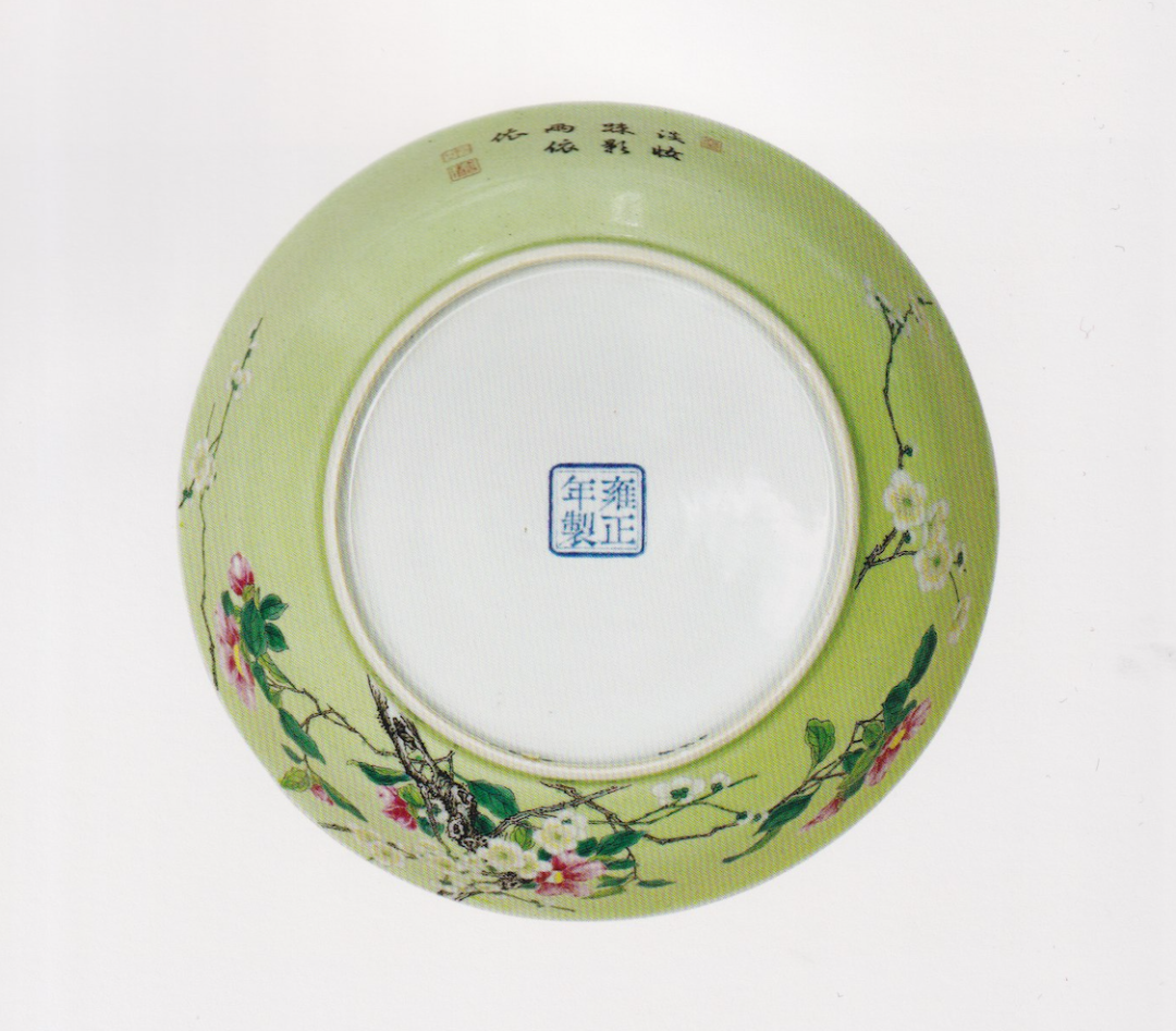 景德镇御窑厂的窑工们烧制出这件精细的白瓷盘,并运往紫禁城内的造办处进行彩绘。盘子外壁的一面以珐琅彩绘一丛交缠的折枝梅花与山茶花,另一面以黑彩书有一七言诗句:“淡妆辣影两依依。”此诗句出自康熙皇帝于1706年编辑的《佩文斋咏物诗》卷八十六。与许多中国诗歌类似,此诗句既可理解为对两枝花影的吟诵,也可解读为暗喻宫廷仕女。雍正帝开创了在雍正瓷器上使用这些咏物诗的先例。诗首与诗尾共带有三枚印章,与图版47相同。盘子外壁的底色是鲜明的青绿色,这也是雍正瓷器在西方技术影响下的首创。科学家爱德华·T·霍尔教授(EdwardT. Hall, 1924 ~ 2001年)曾分析过这种青绿釉,结果显示它的成分是在锑酸铅中加入了铜。虽然锑酸铅在中国储量丰富,但中国窑工较少使用该种彩料,在欧洲,锑酸铅则是被用于玻璃、釉药和油彩中的一种明黄颜料。盘外底带蓝料双框“ 雍正年制”四字款。