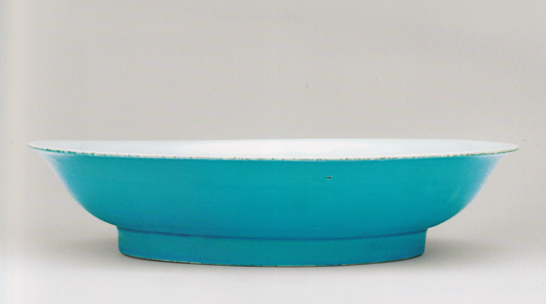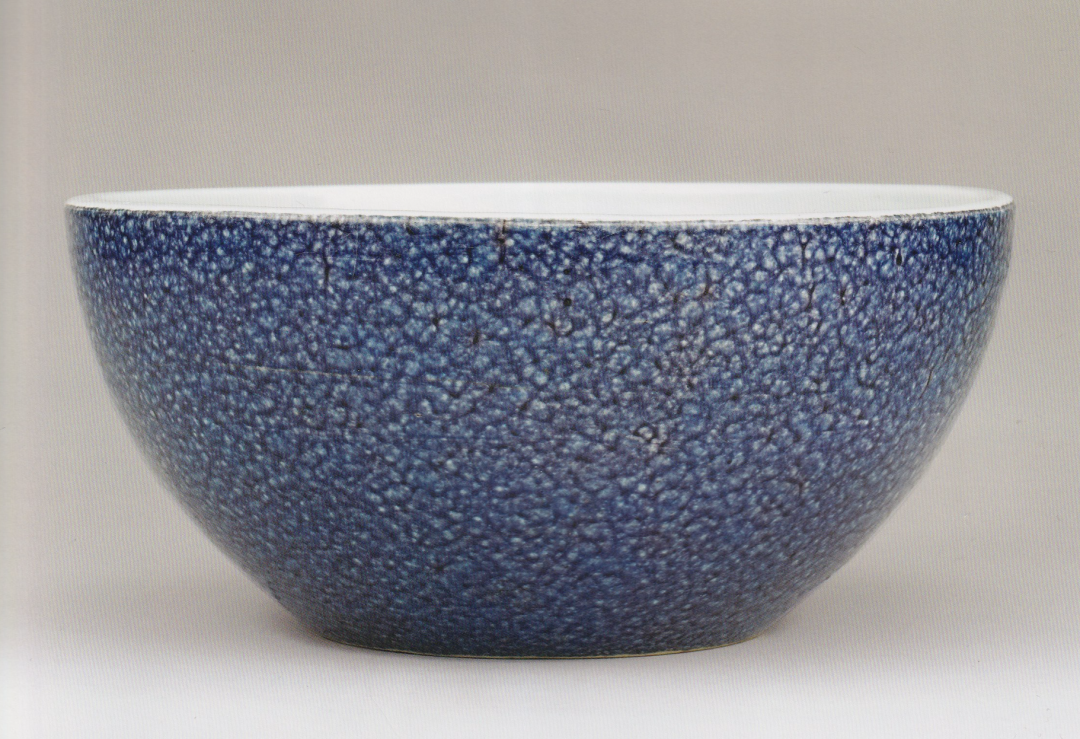 这种胎骨沉实的钵,其造型与釉色均是宣德窑的创新之作。钵经两次入窑烧成。外壁使用了吹釉的手法,形成仿如雪花般或蓝色斑点效果的蓝釉色。“雪花蓝” 以氧化钻为呈色剂,使用铅为助熔剂,在大约800℃的低温下烧成。中国传统的监赏家、收藏家及学者等用“雪花蓝”来形察这种蓝釉中仿如自雪纷飞的艺术效果。传世的雪花蓝釉瓷器非常稀少,在窑址上曾出土过这种雪花蓝釉的梅瓶、碗、水仙盆、高足杯等器型的残片,可能是仅处于实验烧制阶段的雪花蓝器型。在钵的内底心上书有釉下青花六字宣德年号款;钵的外底与浅而阔的圈足则无釉。1983年,景德镇珠山明代御窑厂遗址曾出土过一件几乎完全相同的器物。某些学者认为这些胎骨厚重的钵,曾用于宫中的掷骰子游戏。