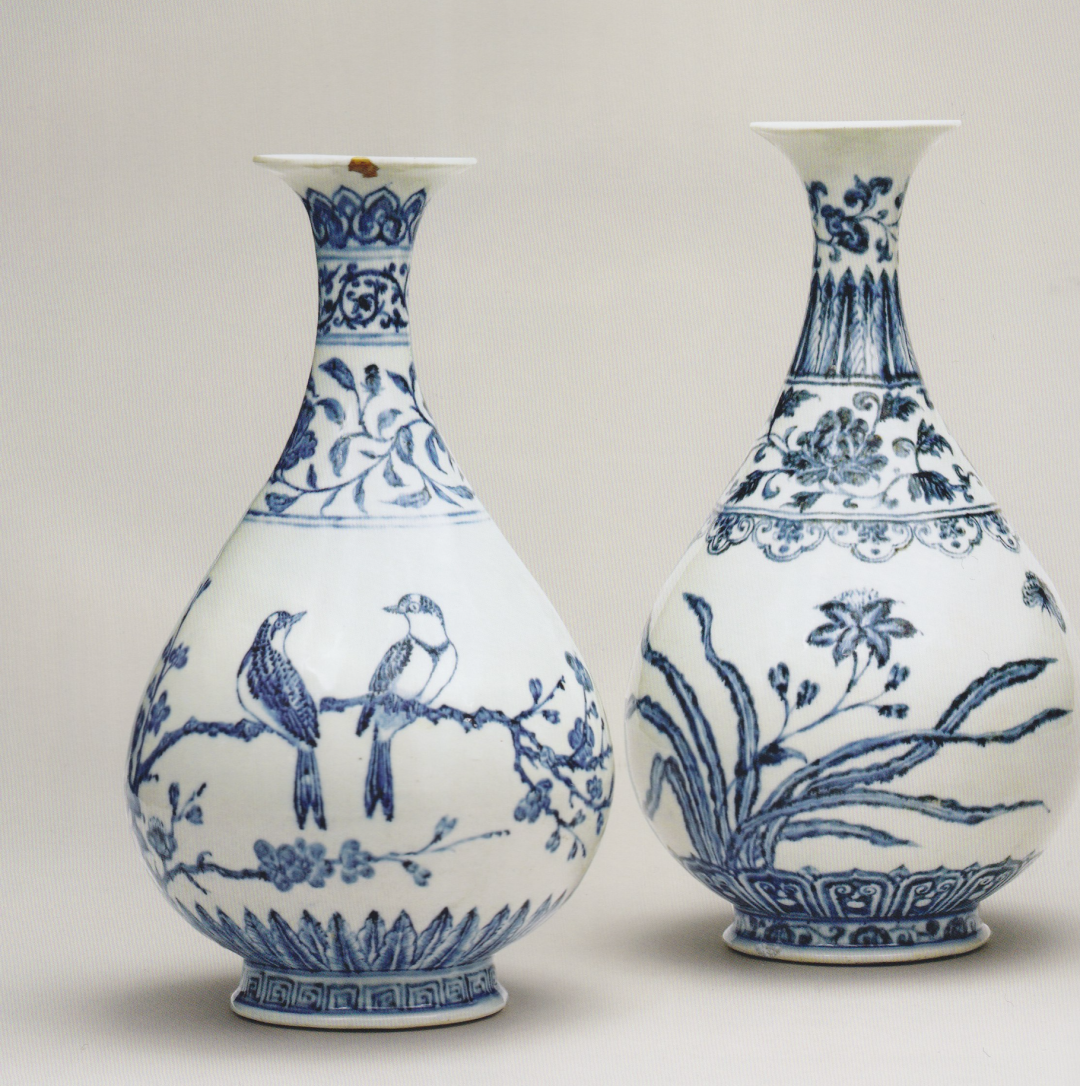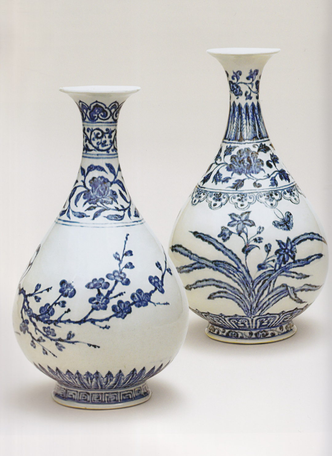 元代及明洪武时期的青花瓷器以繁复密集的装饰纹样为特点,至永乐,由于白瓷胎品质的进一步改进,窑工们得以发展出一种创新的纹样装饰风格,将纯粹而浓艳的青花钴蓝色在雪白而微闪青色的瓷胎上充分表现出来,使艳蓝纯白形戚了强烈的视觉对比效果。永乐青花瓷器因之被称为中国陶瓷史上最精美的青花瓷,这种史无前例的光洁细润的釉面效果和品质,一直是后世不断竞相模仿却永远无法企及的。永乐的窑工们使用进口钻料,经火烧呈色不均,呈现出色阶变化丰富的蓝色,由浅灰蓝至接近黑色的深蓝。这三件作品也代表了永乐青花纹饰的最高品质和水平,它们的构图受到了15世纪同时期宫廷画作的启发,特别是一些非常紧凑的绘画形式例如扇面或册页上所看到的,优雅不凡。