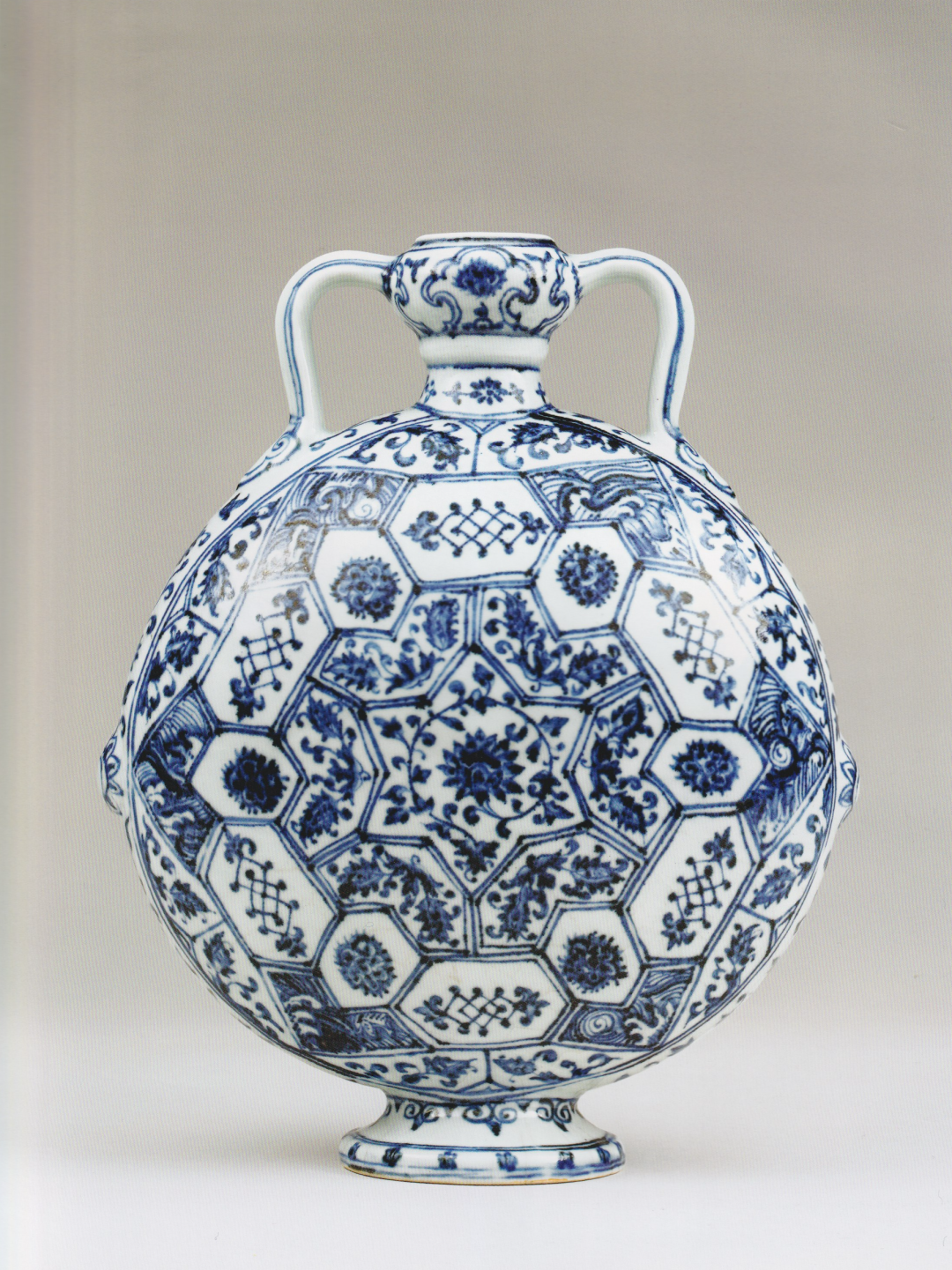 这件扁壶的造型与装饰纹样均非常独特。扁圆形器身的两侧中央各有一呈凸起状的圆钮,下承外撇圈足,有双耳和圆颈。青花纹饰以同心圆的样式呈放射状从中心的六角形开光向外层层铺排,开光内是一朵卷枝莲花。这种密不透风的装饰纹样风格,使人们联想到近东地区生产的金属镶嵌器。景德镇窑工们此时不但参照近东地区餐具的造型来为海外贸易市场烧造瓷器,同时也为满足明朝宫廷此时正流行的舶来风尚而设计生产这类带有明显伊斯兰艺术风格的官窑瓷器。至清雍正皇帝(1723 ~ 1735年在位),这类扁壶又被重新仿烧,如北京故宫博物院即珍藏有一件类似的雍正窑作品。