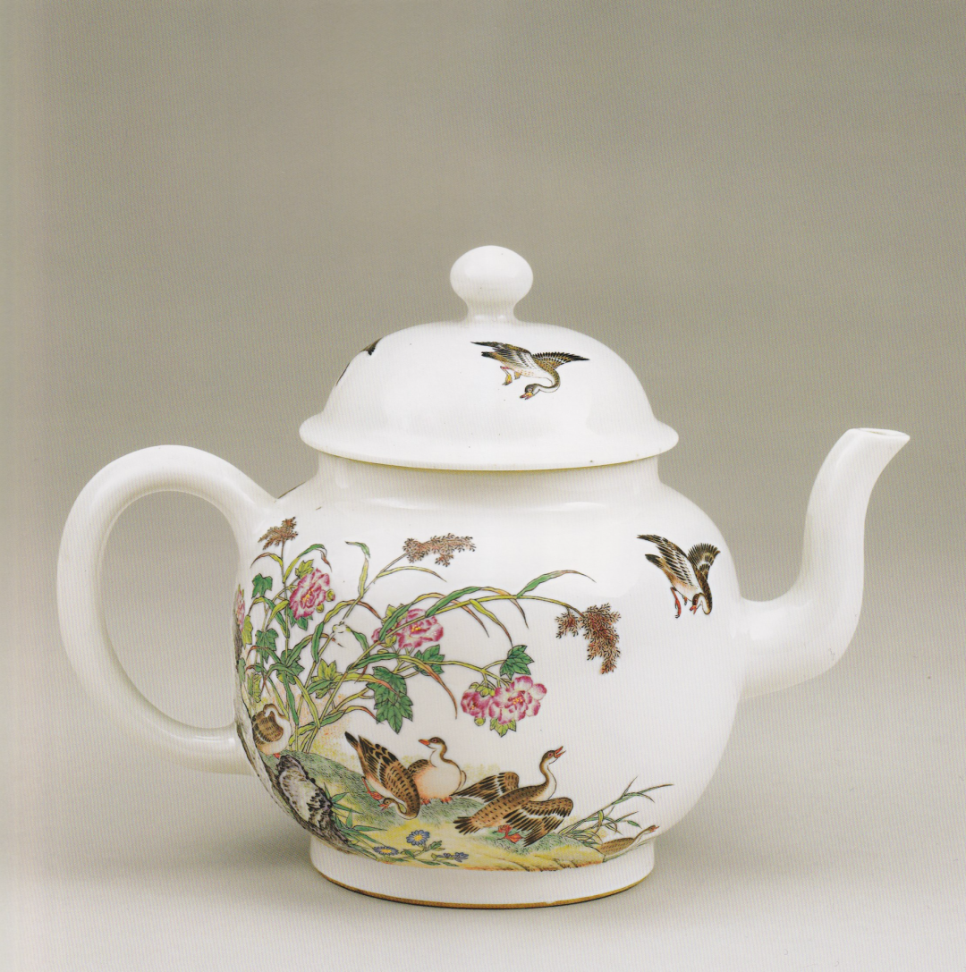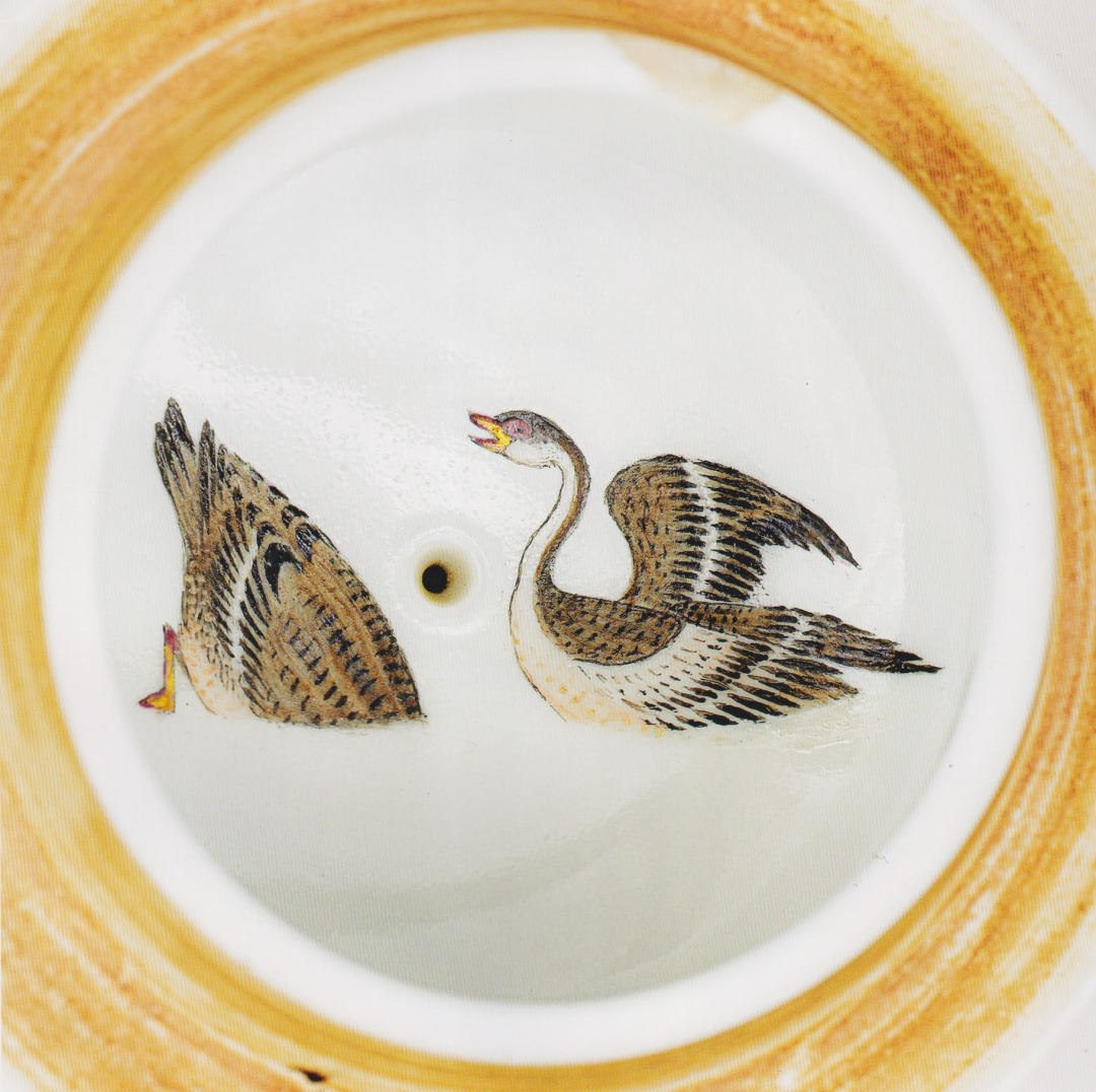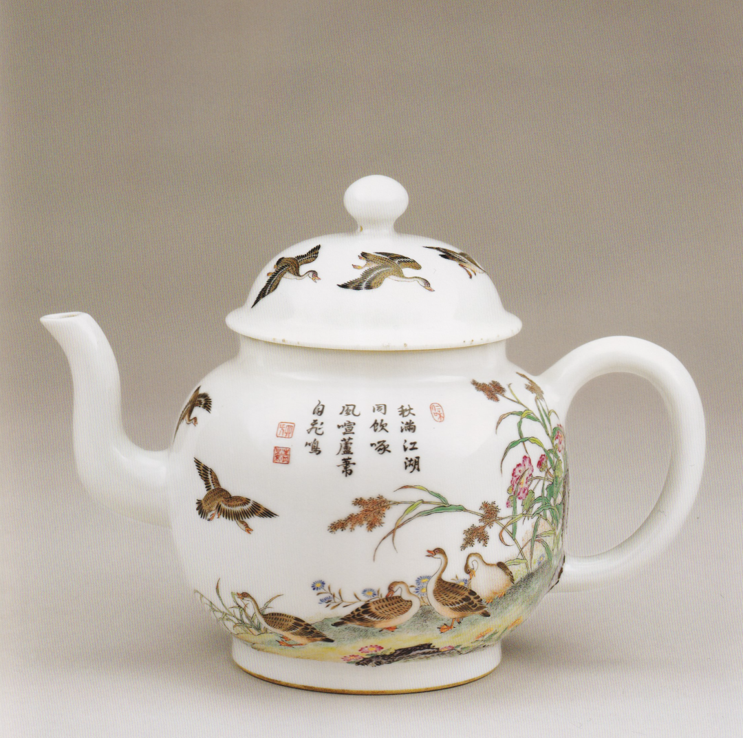 紫禁城内的瓷器画师在这件茶壶上用珐琅彩画出了一群大雁,有些在天空飞翔,有些停栖在长满芙蓉花、芦苇和蒹葭的河岸或湖滩上。壶的另一面用黑彩书写七言短诗两句:“秋满江湖同饮啄,风喧芦苇自飞鸣。”首句生动直接地描写雁群,次句则采用间接的方法有所隐喻。诗首与诗尾共有三枚褐彩印章,曰“仁和”、“四方”与“清晏”。这些合起来则是皇权王道的象征:君主仁政、天下太平。与传统的中国绘画一样,这把茶壶上的画面与书法题诗互相辉映。一般的茶壶盖内并无装饰,但这把茶壶的盖内却罕见地绘了两只大雁,一只在畅游, 另一只则埋头在水中觅食。壶底带蓝料四字乾隆年号款。