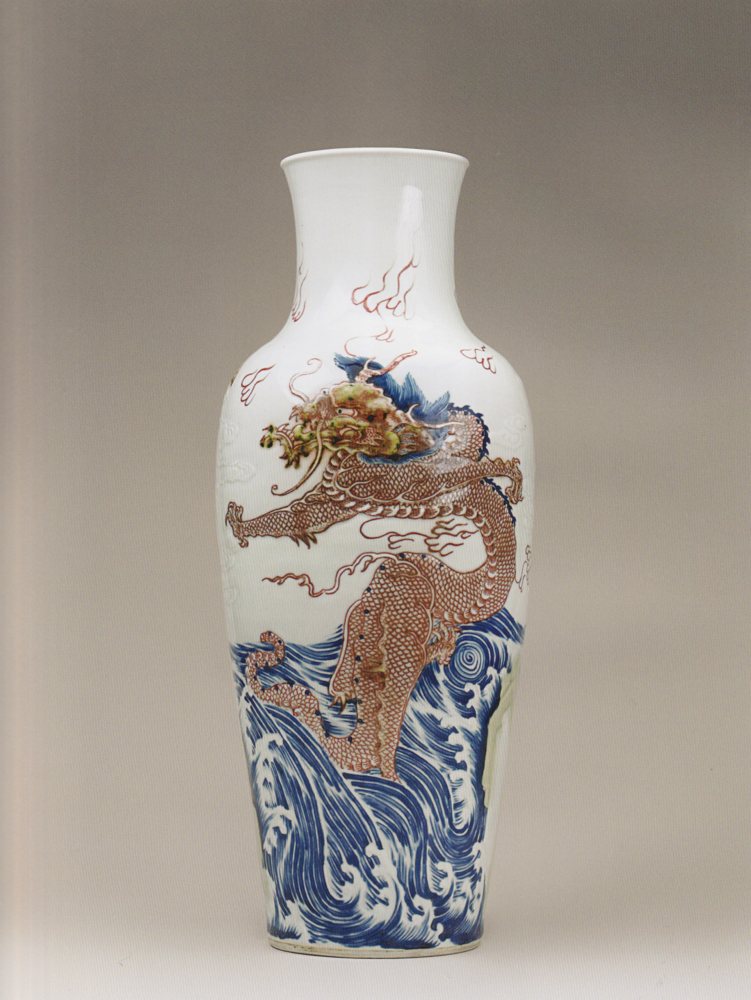 窑工们在这件瓶子上展示出清湛的窑饶技术,即将三种烧造难度很大的釉色同时呈现在一个瓶子上,这种卓越的技术水平与成就也显示出朝廷此时对瓷器烧造的大力扶持与严密监管。窑工首先在瓶身上以浅浮雕法剔刻出两条四爪龙纹,以铜红装饰龙身,再以釉下钻蓝描绘海水、画出鬃毛和龙脊,最后用铁青染出绘海礁石的轮廓。另外用钴蓝色点出龙睛,以强调龙的生动感,并在背下点蓝彩用以增强奇异感。虽然早在三百多年前的元代,景德镇窑工们就同时使用过釉下高温铜红彩和钻蓝彩来做装饰(参见图版23),但另外加入使用铁青色则是17世纪晚期的新发明。这件瓶子系奉康熙帝旨意烧制,瓶底带有青花双圈三行六字康熙年号款。