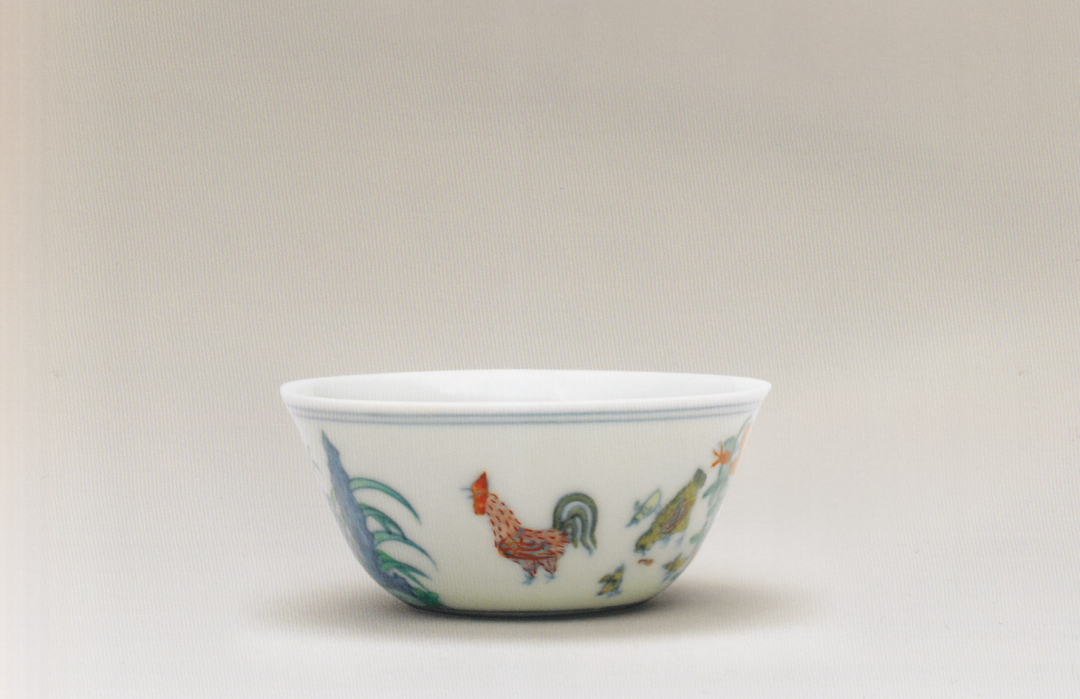 因为与“吉”同音,鸡在中国传统文化中是吉祥的象征。母鸡带着小鸡们在花石丛边啄食的艺术主题,首先见于绘画,并启发了工匠们在瓷器上的纹样设计,台湾学者蔡和 壁就曾引述过台北故宫博物院珍藏的一幅宋代佚名的母鸡与小鸡觅食图,该画并附有1486年成化皇帝御笔题签的赞美之词。窑工们用不同层次的釉彩来体现不同的质感:如小公鸡身上的羽毛用了细小的红彩点出,母鸡的翅膀以红彩勾勒再用黄彩敷染羽毛。而在几百年之后,才发现出现了以不透明的釉彩进行多层渲染的技法。杯子上描绘来真实生动的场景:一只小鸡正扑扇着黄色蓬松的翅膀回到鸡群里。成化斗彩鸡缸杯的仿制,从16世纪开始一直延续到现在。真正的成化瓷胎骨微闪淡黄色,并有轻微的变形,鸡群的构图也非常均衡。
