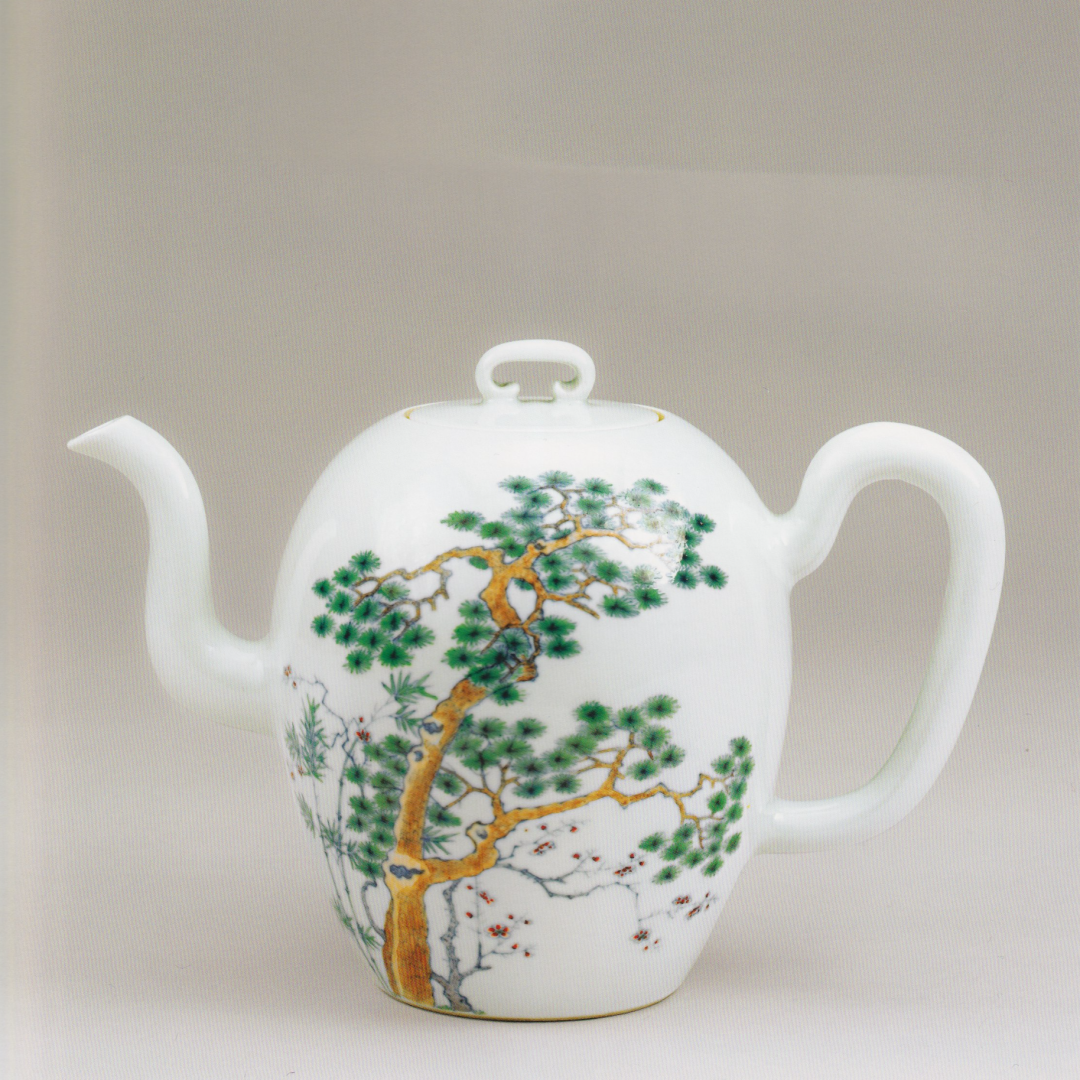 这件执壶是在清代(1644 ~ 1911年)以斗彩形式绘制而成,即在釉下用青花线勾勒出纹样的轮廓,再在釉上于青花线轮廓中填染绿、紫及褐等釉彩。梅花则以极细致的红彩点染,突出对比效果。将青松、翠竹、红梅描绘在一起的纹饰,传统称为“岁寒三友”图,长青的松树象征坚稳与长寿;苍翠的竹子象征逆境中不屈的君子气节;新春后先于百花傲寒怒放的梅花,则象征高洁气质和领袖风范。壶底书雍正青花六字方章款。
