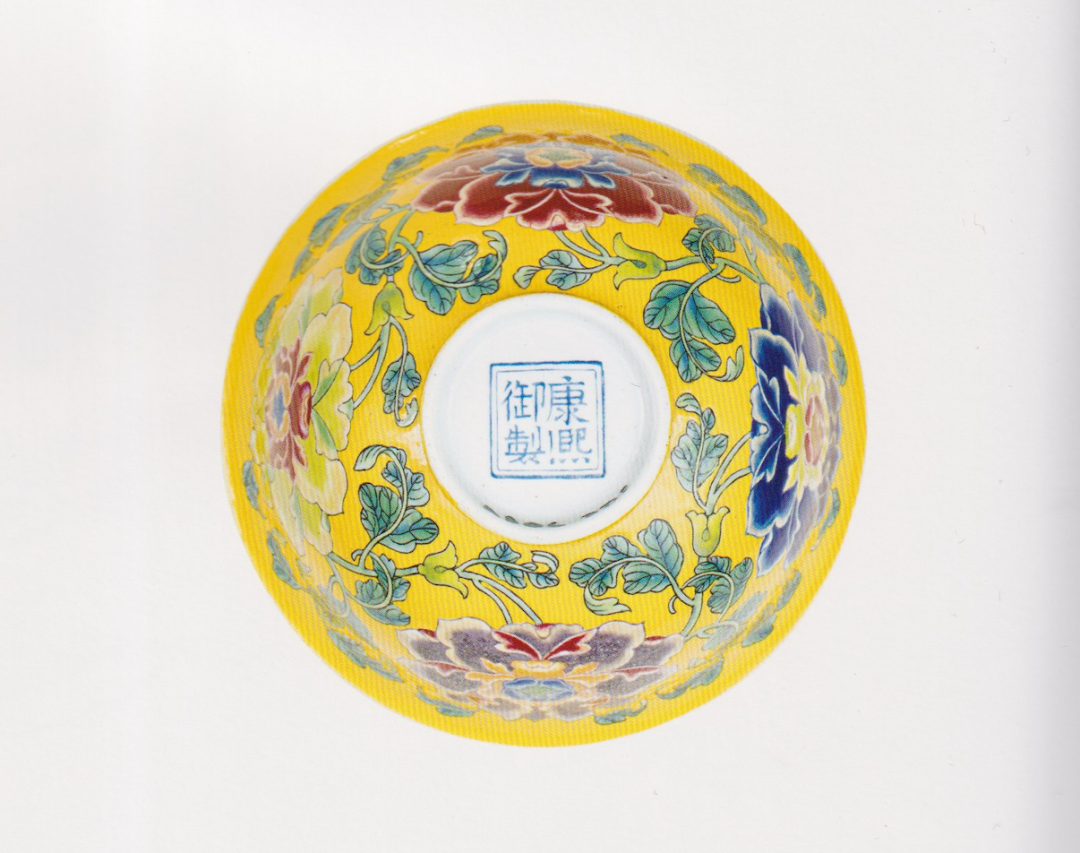 康熙皇帝在紫禁城内设立了珐琅作,专门在此装饰瓷胎、铜胎和料胎珐琅器。康熙时期有许多来华的西洋耶稣会传教士,康熙皇帝看到他们带来的西洋珐琅器件后受到启发,并决定再造这些舶来品。造办处负责管理和经营这些作坊,并向景德镇御窑厂定制了品质上乘、胎釉洁白的素瓷,然后运来北京宫中的珐琅作进行加彩。珐琅料的调色、质感与上彩方式均与景德镇所用(比较图版44)不同。康熙瓷胎画珐琅的纹样设计是高度格式化的形式,这是因为工匠们受到了在宫中制作已经相当普遍的铜胎掐丝珐琅器的影响。景德镇御窑厂生产的官窑瓷器均书写青花年号款,而在造办处珐琅作完成的瓷胎珐琅器则写釉上蓝料款,正如这件在宫中造办处上彩的牡丹纹碗。同时,景德镇瓷款识中的“年”字被“御”字所代替,双框四字蓝料“康熙御制”款,就是奉御旨专门烧制的意思。