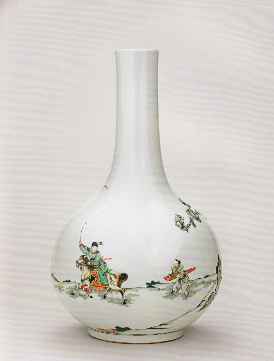这件瓶子上描绘的是一位骑在马上的文官,他的侍从尾随在后,手里拿着一具花布包裹着的古琴。文官高举马鞭,指向空中一对正从交缠的杏花和木兰花丛中飞出的鸟儿。当代中国学者倪亦斌博士认为这个画面可能是来自唐代诗人孟郊(751 ~ 814年)的作品《登科后》:“昔日龌蹉不足夸,今日旷荡恩无涯。春风得意马蹄疾,一日看尽长安花。”