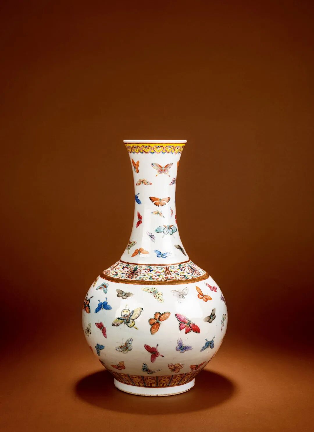 拍品清宣统粉彩百蝶赏瓶为晚清御瓷之隽品,形製规整端庄,胎釉精良,莹白温润,几近康雍二朝之水平,通体以粉彩“百蝶富贵”图,所见彩蝶翩翩起舞,姿态各异,设色华丽,俱不相同,笔意工整,翅质表现细腻,无论点、擦和线条均流畅生动,宛若趣意盎然的国画小品。“蝶”与“耋”谐音,因此百蝶寓有“寿至耄耋”之意。