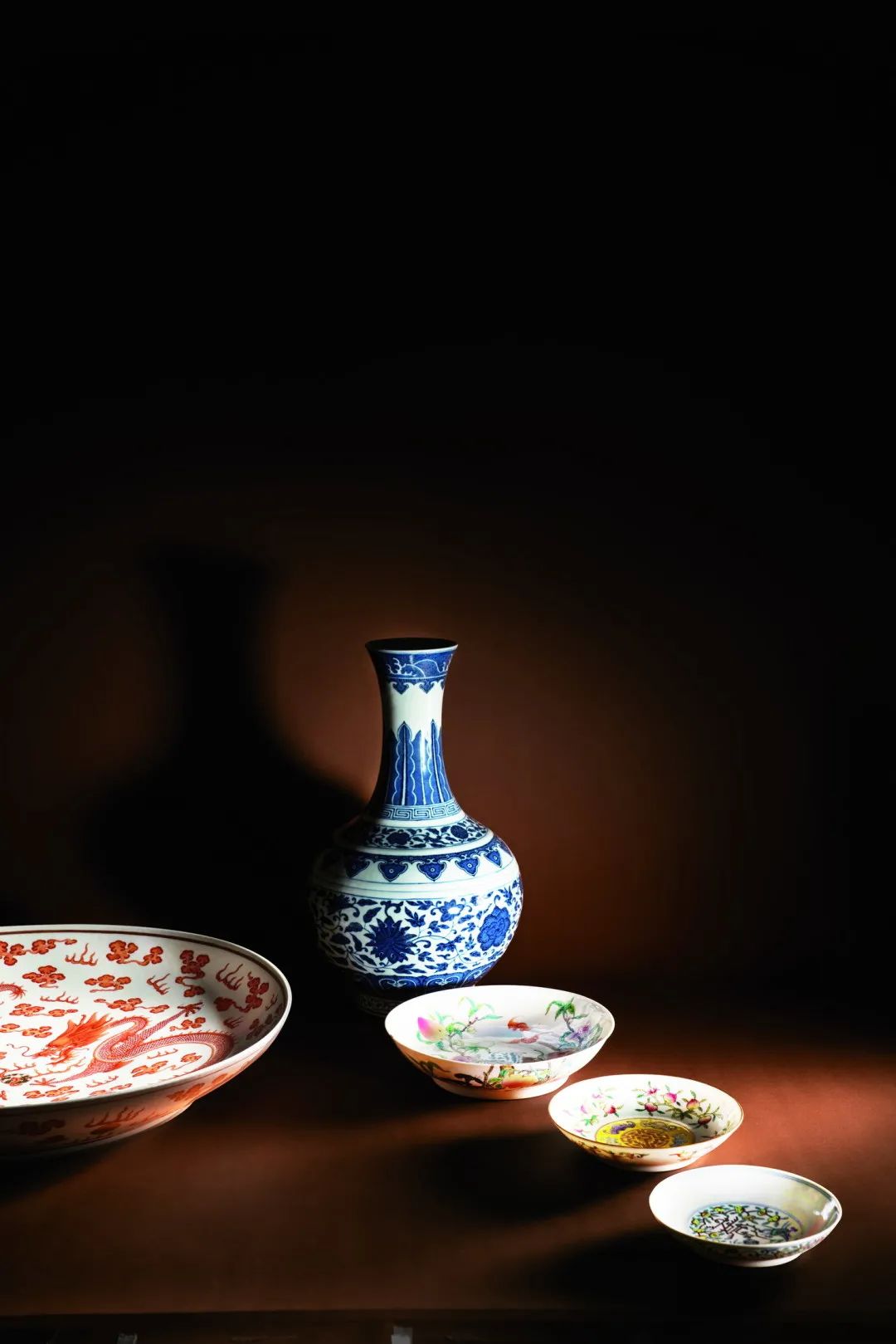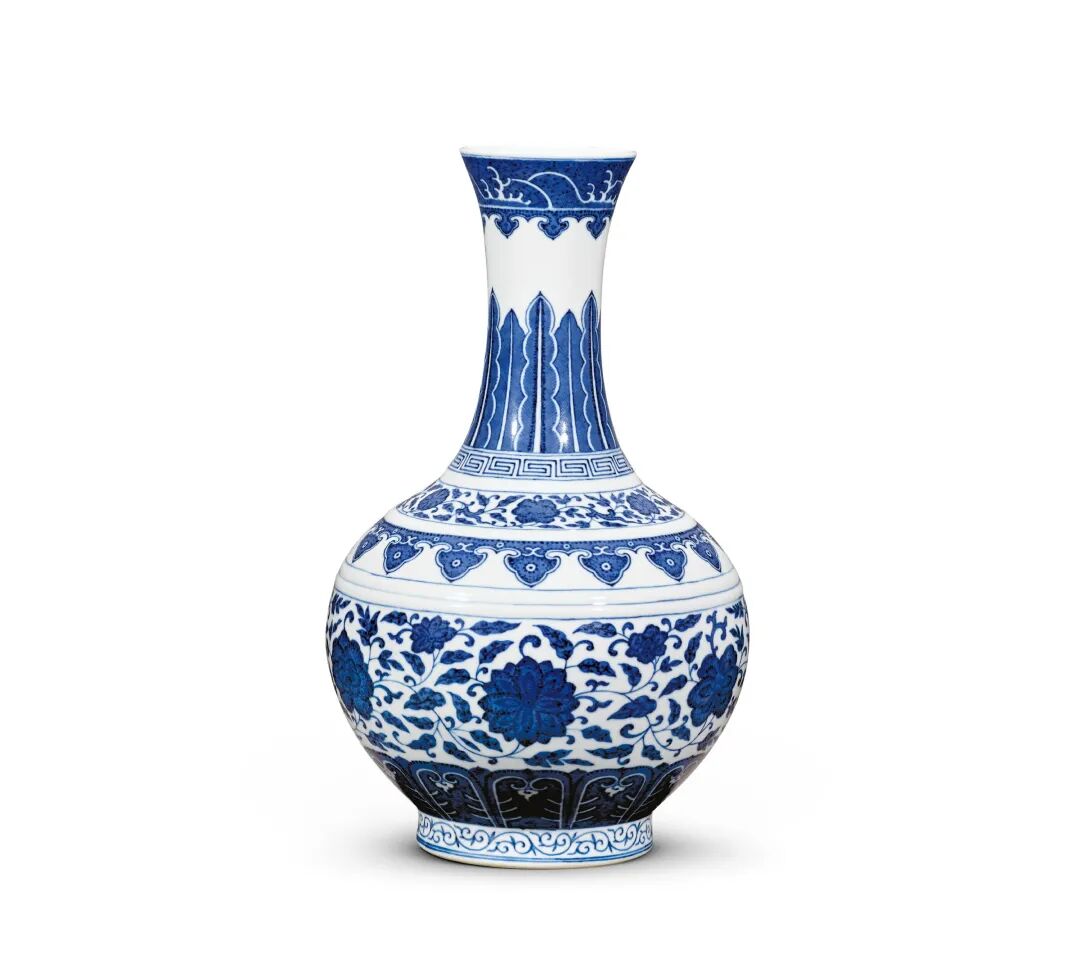 拍品品种与故宫博物院藏品相似(参见《故宫博物院藏古陶瓷资料选萃》卷二,页203,图179)。拍品器型规整,青花发色鲜艳,自口沿而下分绘海水波涛纹、如意云头纹、蕉叶纹、回纹、缠枝花卉纹、如意云头纹、缠枝花卉纹、莲瓣纹、卷草纹等多层纹饰。布局层次清晰,绘画流畅,笔触细腻,製作精细,发色鲜艳,实为光绪官窑典型器。