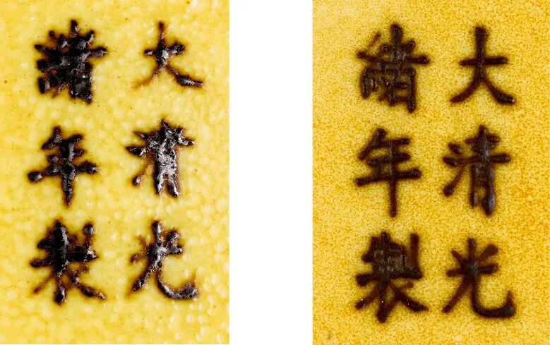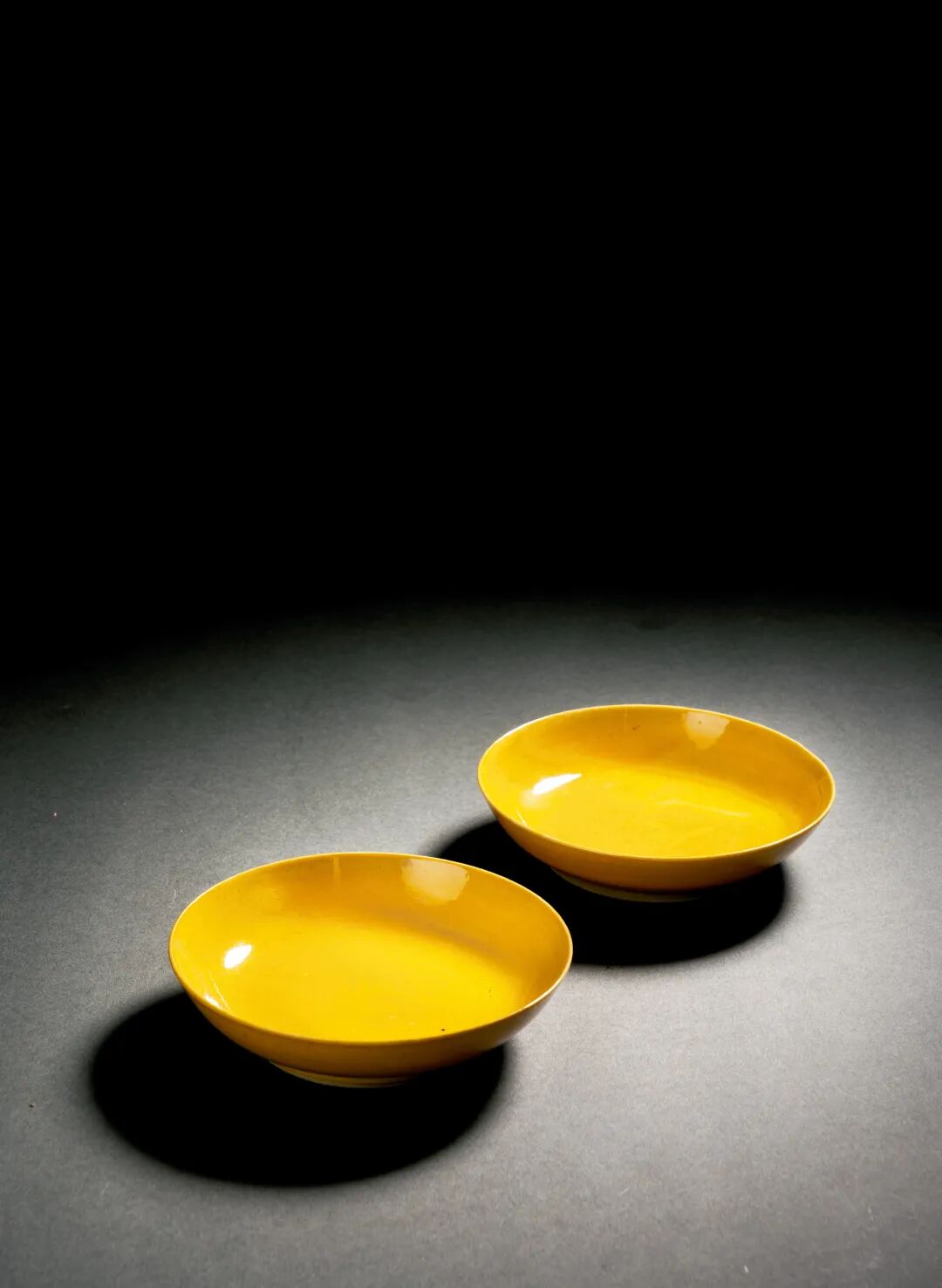 说明:拍品敞口,弧腹,圈足,通体均施黄釉,釉面肥腴滋润,呈色娇嫩清亮,底落“大清光绪年製”六字二行楷书刻款,刻划工整,字体严谨,此对盘器形规整秀雅,胎质细腻坚致,釉色纯正均匀,为清代官窑之传统品种。