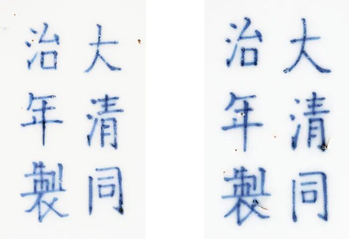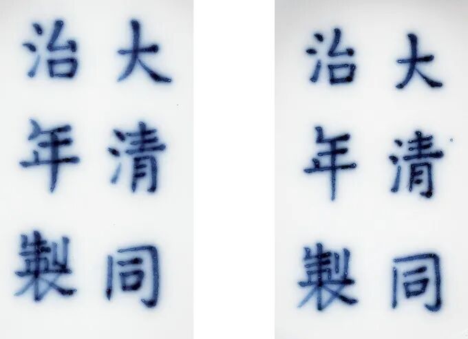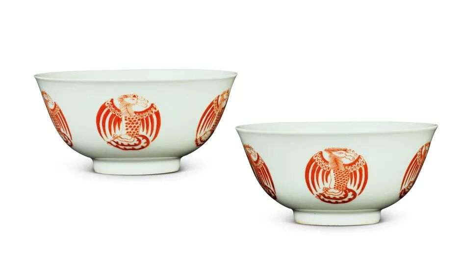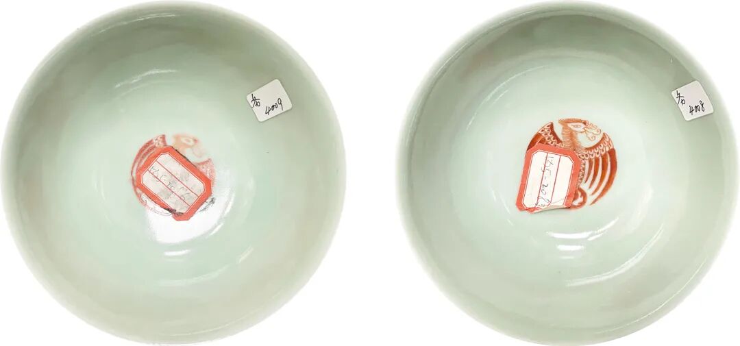 说明:此对碗侈口微撇,弧腹下承圈足。碗内外壁均施豆青釉,碗内底矾红绘一组团凤纹,外壁绘五团凤纹,色彩凝重。碗胎坚釉润,器型规正,构图简洁,笔法细腻,绘画精细,豆青釉呈色沉稳。豆青地矾红为康熙时期新创的瓷器品种,工艺复杂,风格独特,呈色雅致庄重,底部青花书“大清同治年製”楷书款。