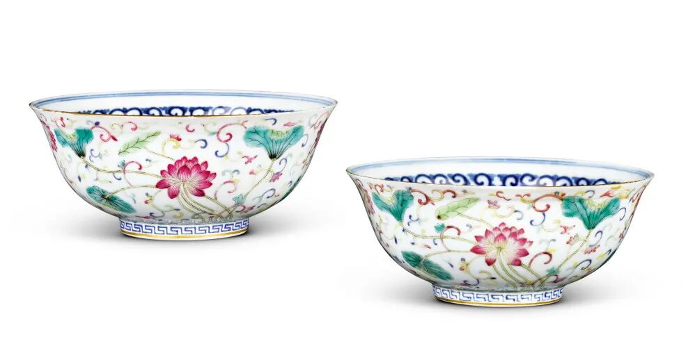 说明:本品是光绪官窑标准器。碗撇口,弧腹,下承圈足。造型典雅大方,製器规整协调。碗口沿、底边皆描金。内壁绘青花缠枝莲纹,碗心开光内绘变形荷花纹,青花发色浓郁,绘事精巧。外壁粉彩饰荷塘清趣图。莲花风姿绰约、亭亭玉立,似含羞少女;莲叶田田密布,一碧千里,若碧波荡漾。花叶穿插错落,以墨彩勾绘,内填鲜妍粉彩,构图繁密,色彩鲜艳,极富装饰效果。莲茎深固于淤泥中,花叶繁茂,寓“本固枝荣”,表达根基牢固之意。足墙环绕一圈青花几何纹。底书“大清光绪年製”六字双行楷书款。整器製作规整,胎质洁白,发色鲜艳,画工精细,且成对保存,殊为不易。