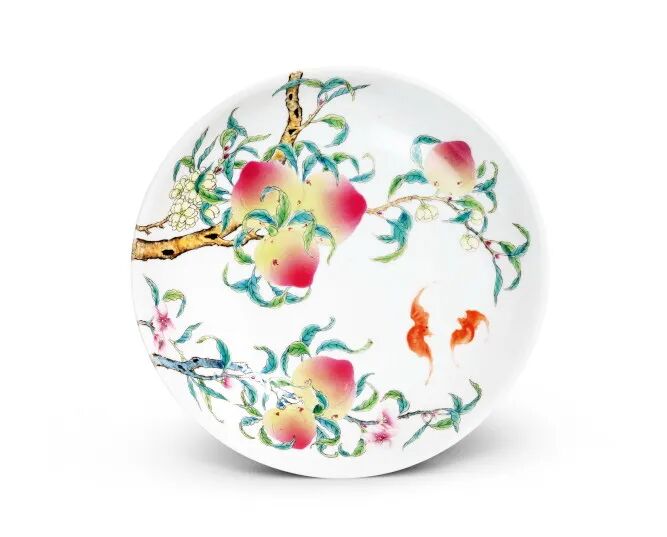 此件光绪粉彩过枝九桃纹盘完全沿袭雍正旧製,绘工细腻精湛、设色鲜亮典雅,大有“南山仙桃大如牛,一食能益千年寿”之意。胎质细洁致密,釉质肥润莹白,製器考究规整,造型端庄有度。其製作之精几可与雍窑比肩,堪称光绪一朝杰作。