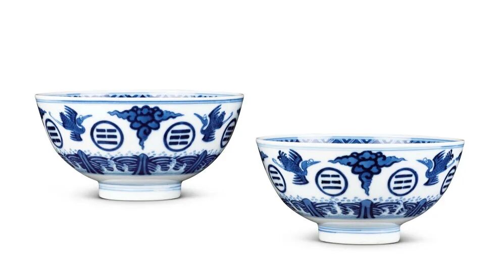 说明:拍品敞口,深弧壁,圈足,小器大样,造型周正。内口沿饰一周锦纹,碗心为轮花海水纹,构图新颖别致。外壁八圆形开光内分别绘“干、坤、震、巽、坎、离、艮、兑”八卦符号团纹,卦间夹绘双鹤拢祥云纹,下为海水江牙纹,青花发色凝重,细勾填涂,用工穷侈。《易传》认为八卦主要象征天、地、雷、风、水、火、山、泽八种自然现象,每卦又象征多种事物。此对碗青花色泽浓郁,为清同治官窑传统品种。成对传世,颇为难得。