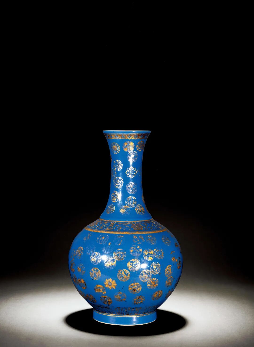 说明:此瓶撇口,长颈,溜肩,球形腹,圈足。瓶身通体施霁蓝釉为地,浓艳深沉,釉面润透。其上描绘各式花样的金彩皮球花,金彩艳丽,尽显祥瑞吉庆,布局匀称,线条细腻流畅。口沿、肩部、胫部分饰如意纹、缠枝花绘纹、蕉叶纹。整器造型规整,绘工精巧细致,纹饰华丽,金彩绚丽,霁蓝庄重静穆,交错相映,有富丽堂皇之感。底书“大清光绪年製”六字楷书款。