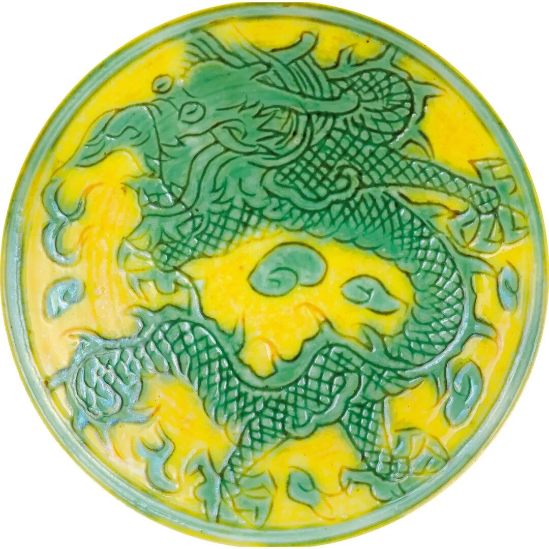 说明:整器黄绿两色发色良好,格调明快,纹饰镌刻流畅生动,且整器品相良好。黄色历来为古代帝王珍爱,故其使用也受到严格控製。根据目前的考古资料显示,黄地绿彩工艺最早出现于明初永宣时期,其具体做法为先在素胎上锥刻纹饰,然后以高温烧成涩胎,复施黄釉绿彩,再低温烘烧而成,整个流程极为复杂,因此在明清两代御窑之中,相对其它品种而言,黄地绿彩瓷的烧造数量可谓少之又少。色釉地龙纹瓷器起源于明代永乐时期,清代康熙、雍正、乾隆三朝大量製作。其龙纹不是像彩绘瓷那样直接用颜绘画,而是先在白胎上勾出龙纹的图案轮廓后经高温烧成素瓷胎,其中黄地龙纹是皇家控製最严格的一种釉色和官窑极为流行的装饰题材。
