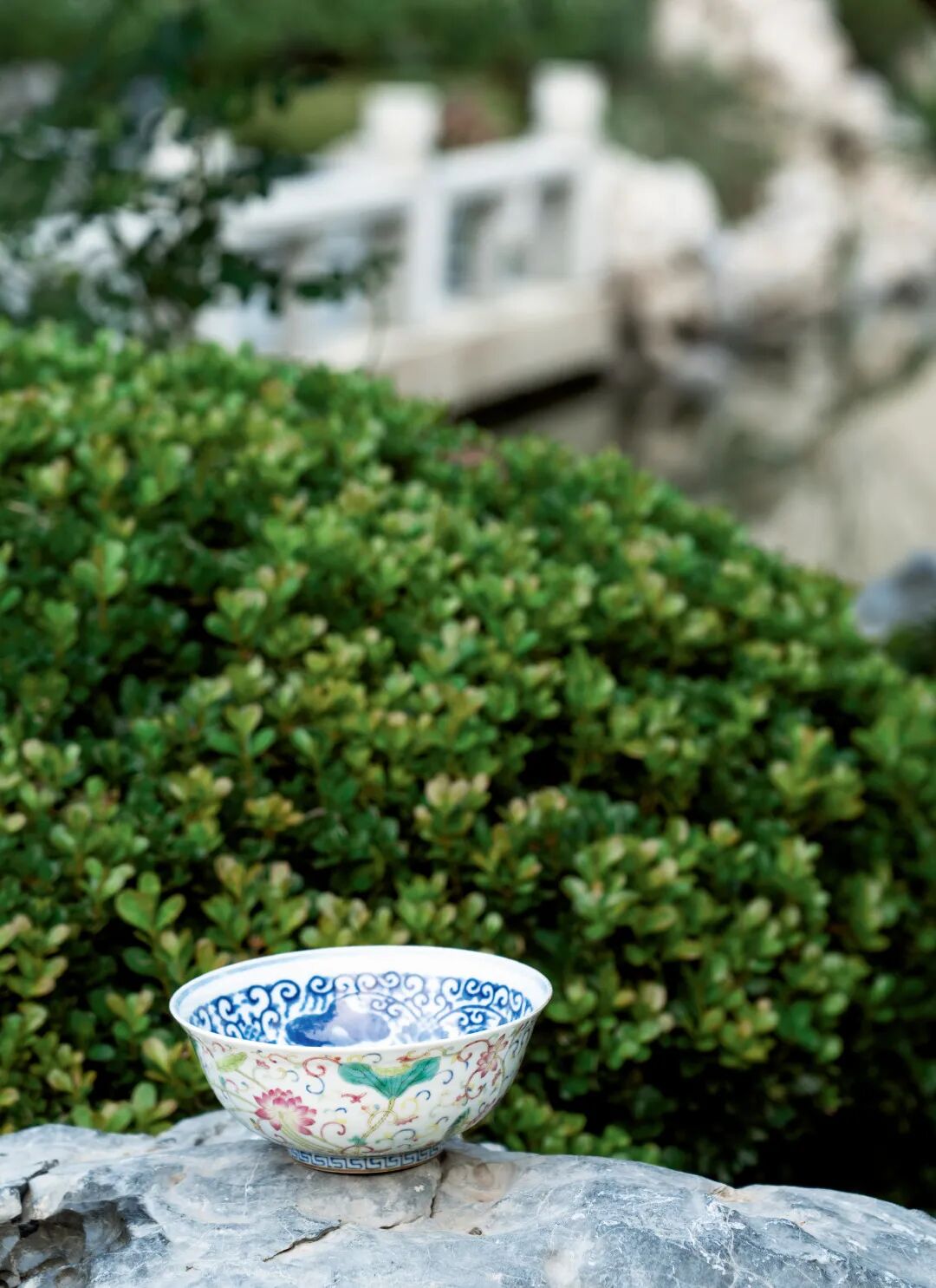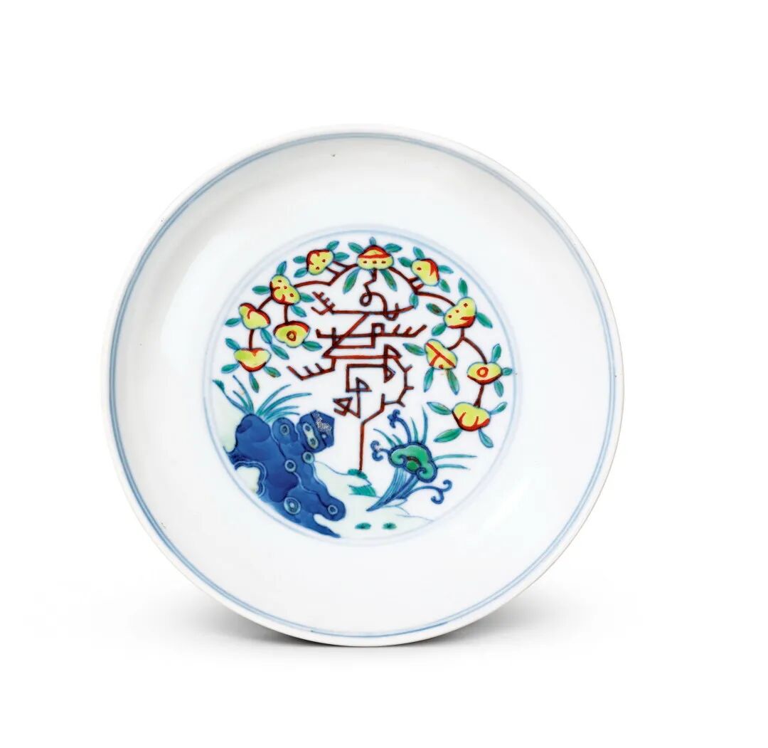 说明:拍品敞口,弧壁,圈足。胎质细腻坚硬,釉色温润。通体以斗彩为饰,青花淡雅,釉彩明亮,运笔清秀流畅,寓意喜庆吉祥,殊为难得。盘口沿内外均以青花双线为饰,盘心双圈青花线内画湖石、灵芝和以桃树枝干盘绕而成的“寿”字,外壁也装饰以灵芝“寿”字纹,与盘心呼应,独具匠心。整体画面都是以长寿为主题,曹植《灵芝篇》有“灵芝生天地,朱草被洛滨;荣华相晃耀,光采焕若神”。祝寿意同拱寿,以灵芝、桃、湖石等寓意长寿之纹饰组成图案,即谓“桃芝祝寿”。