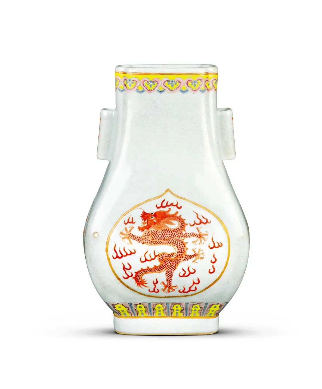 说明:瓶长方口,委角,直颈,溜肩,鼓腹,长方圈足。口沿下绘一周如意云头纹。颈二侧各置一方形贯耳。其上绘一折枝牡丹。腹部四周描金开光,内绘四条红彩火龙。近底处饰一周变形莲瓣纹。