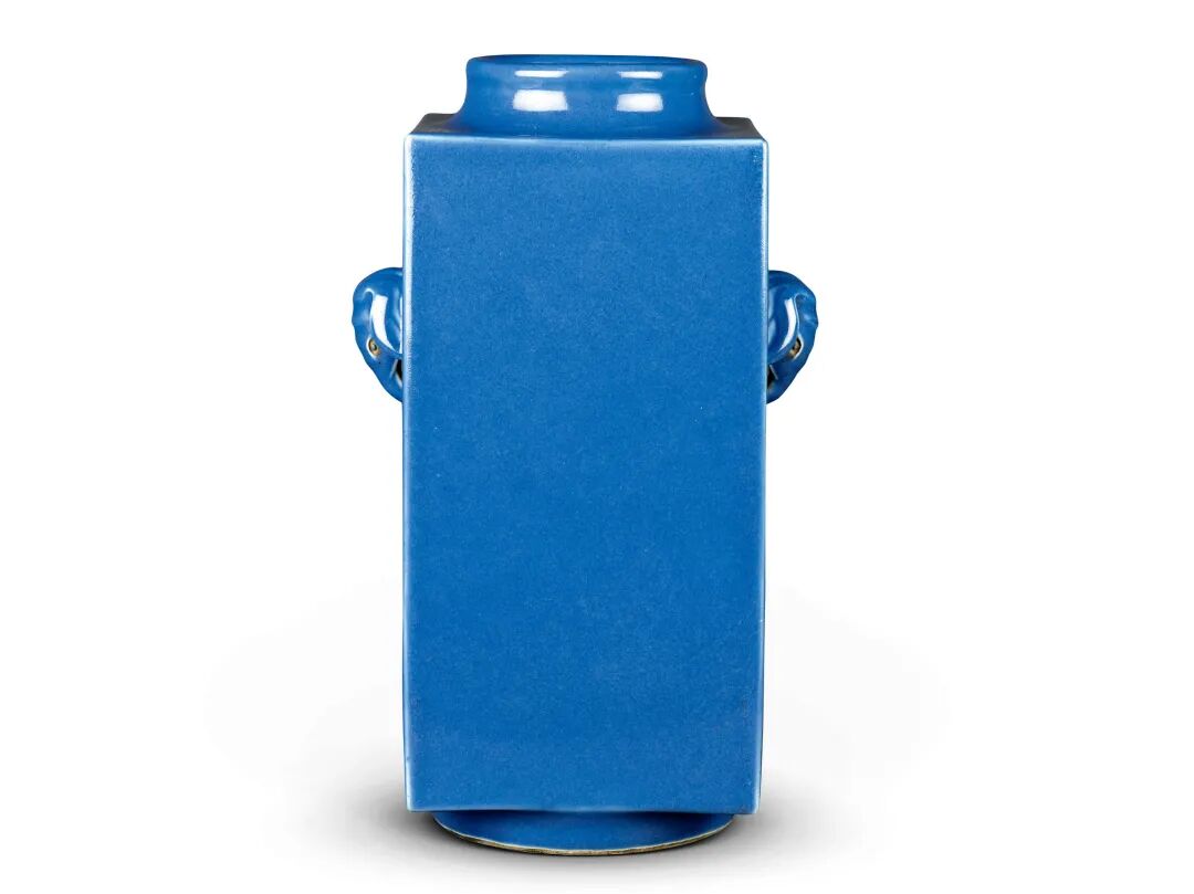 说明:本品为圆口,短颈,方肩直腹,瓶身四方,器型仿良渚文化玉琮而製,故名琮式瓶,暗合中国古代“天圆地方”之思想。琮式象耳方瓶是乾隆时期开始流行的一种瓶式,寓有四方太平有祥(象)之吉祥涵义。此瓶线条利落,简洁端庄,通体施霁蓝釉,釉色均匀浓厚,色如蓝宝石,纯美宁谧,为清代官窑单色釉的标准器。蓝釉器自明以来历朝历代都有製作,一直是宫廷祭天祭祀的用器,而单色釉为明清两代皇家专属不同颜色作不同用处,多数用为礼器,祭器,由此本拍品等级之高,不言而喻。