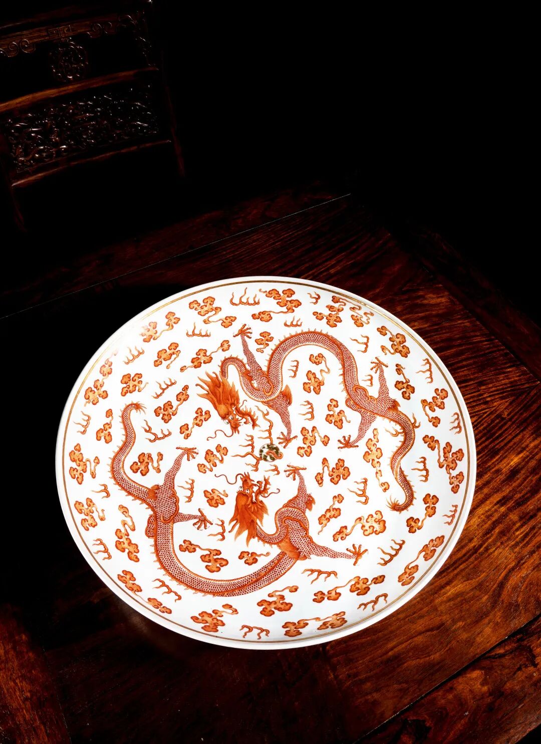 说明:本品呈敞口,弧壁,浅腹,圈足。通体施白釉,釉面光润。口沿饰金彩一周,盘心矾红彩绘双龙戏珠,并以金彩描绘龙珠,金光熠熠。双龙身形矫健,鬃鬣飞扬,鳞片历历,张牙舞爪,展现威风凛凛之态。外壁绘火焰祥云纹,及双龙戏金珠,构图疏朗,色调雅淡。底部矾红彩大清光绪年製六字楷书款。本对盘矾红色调层次丰富,色彩鲜艳,凝而不滞。而纹饰上的构图布局讲究,龙须龙鳞等细节刻划精美,龙有五爪,为九五之尊御用,其双龙周围环绕祥云火焰纹,中部饰宝珠,意表可避水火。