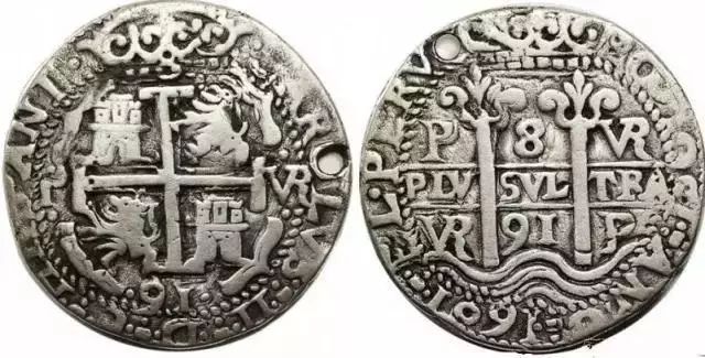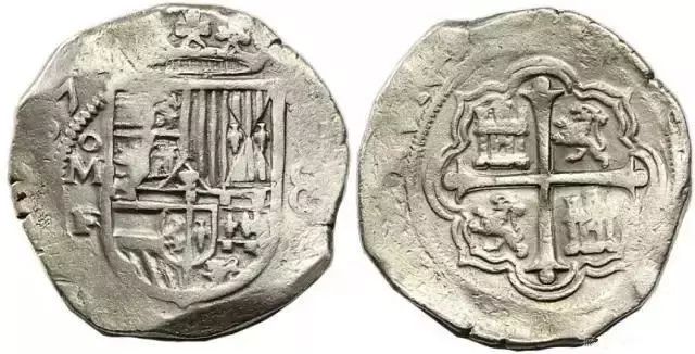 最早流入中国的西班牙银元应该是COB本洋。COB实际上一种打制币,确切的说应该属于银块,形制不规则,但重量和成色适当,欧美一般称作cobmoney,简称cob(卡伯)。 自菲利普二世时期(1556-1598)开始铸造,这类COB一般分为两个大类:一种是正面西班牙盾徽背面十字的;另一种正面双柱背面十字的。![]()
