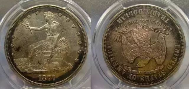 1873年后,美国为了争夺远东贸易和抢占墨西哥"鹰洋"在远东的银元市场,创铸美国贸易银元,铸造的全程时间为1873-1885年。流通中常见品大都是1873-1878年铸造的。从1879-1885年,铸数大量减少。1887年7月美国政府下令收回。由于铸数不多,加之回收、熔化、遗损和烂板,因此品相好的留存极少。![]()