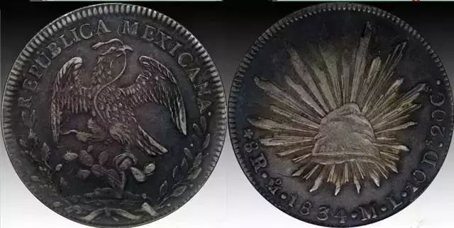 这种双柱币面风格与人像双柱一脉相承,但直径和重量都有缩减,一般被称作小双柱。这些小双柱在华数量不大,影响力有限,混杂在同时期流入中国的各种外币中,已然变得平凡无奇了。 墨西哥于1821年独立后,1824年开始铸造墨西哥银元(Mexican Dollar)。因币面花纹有鹰鸟,俗称鹰洋,误称为英洋,华北各地又称之为正英。据1856年伦敦造币厂对中国流通的银币的一次化验,证明墨西哥银元含纯银371.57英厘(grain),值英币50.21便士,而西班牙加罗拉银元含纯银370.9英厘,值英币50.12便士,两者差不多。 十九世纪六十年代前期,墨西哥银元取代西班牙银元成为在华主要流通银币。到了1910年,上海一地几乎以墨币为主币。有人估计到清末民初,流入中国市场的鹰洋在4亿多枚,当时上海金融市场专门开设鹰洋行市。1905年后,墨西哥采用金本位制,停铸鹰洋,鹰洋流入中国渐少。1919年后上海金融市场逐停开鹰洋行市。![]()