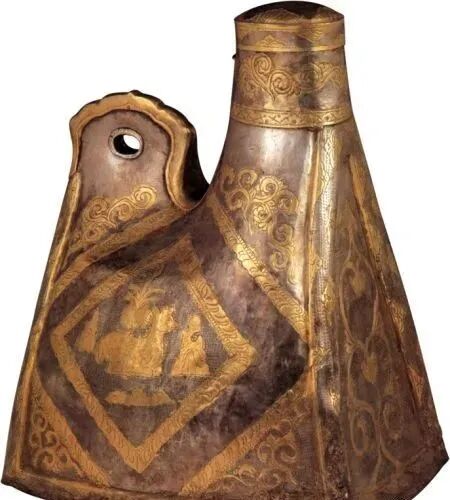 鸡冠壶,辽代特有的陶瓷器型。亦称“马镫壶”、“皮囊壶”。是模仿契丹族皮囊容器的样式而烧制的陶或瓷壶。壶上部有鸡冠状孔鼻,故名。式样大体可分五种:扁身单孔式、扁身双孔式、扁身环梁式、圆身环梁式、矮身横梁式。其年代早晚,通常以壶身所保留的皮囊容器特点的多少来区分。