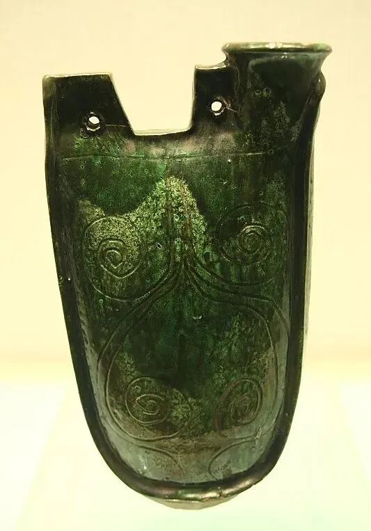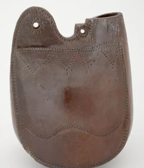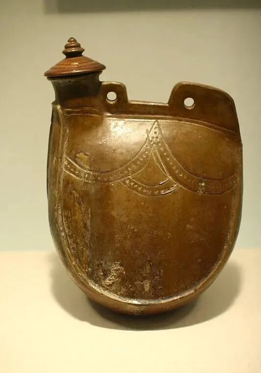 契丹民族勇武善战,长期的游牧马上生活,随身最重要的携带品是皮囊,装水和酒。即使后来慢慢定居下来,但民族生活习惯不变,烧造起瓷器来,依然仿造皮囊的样子做。整个看上去就是一只瓷质的皮囊形状。其实,比起汉民族简洁的碗、盘等圆形器物,这样的造型制作起来麻烦多了,可是,辽人就喜欢这样。