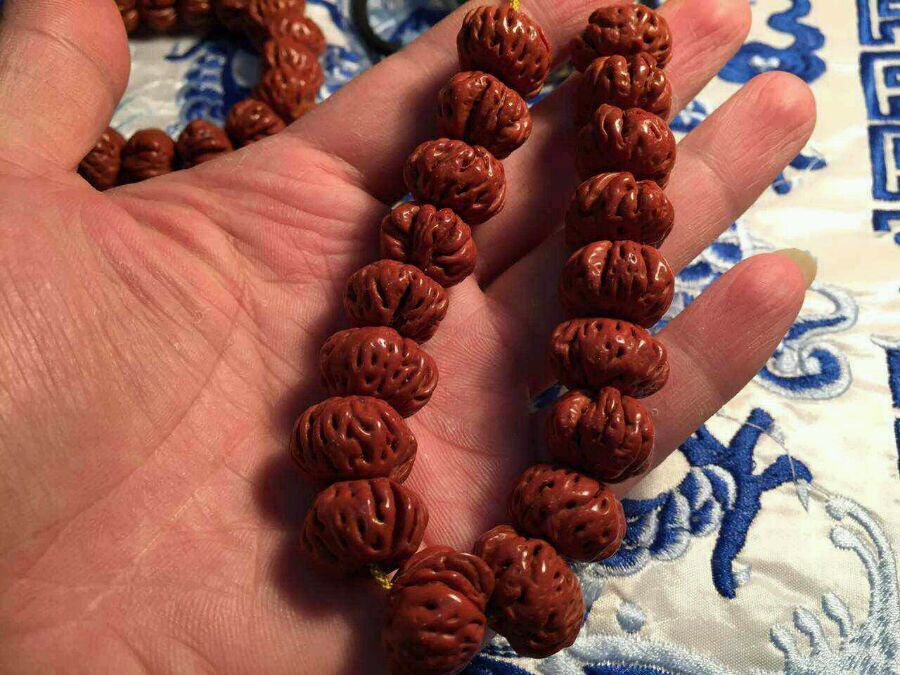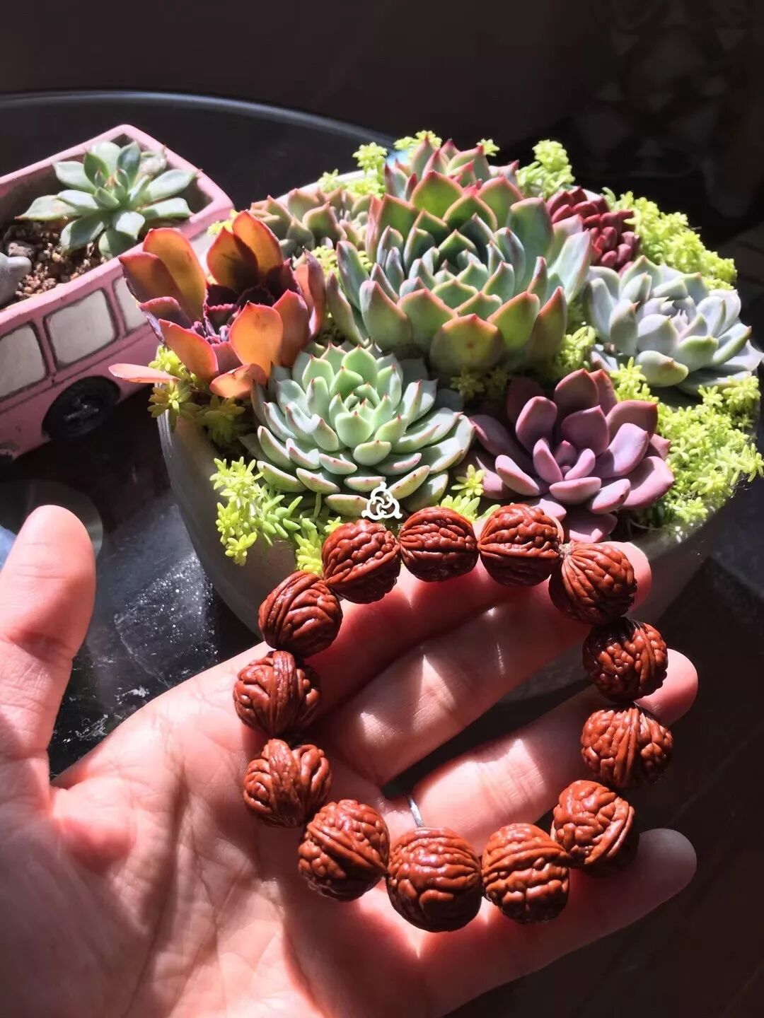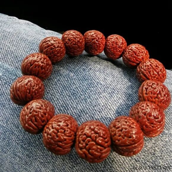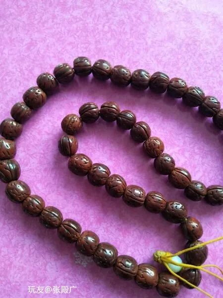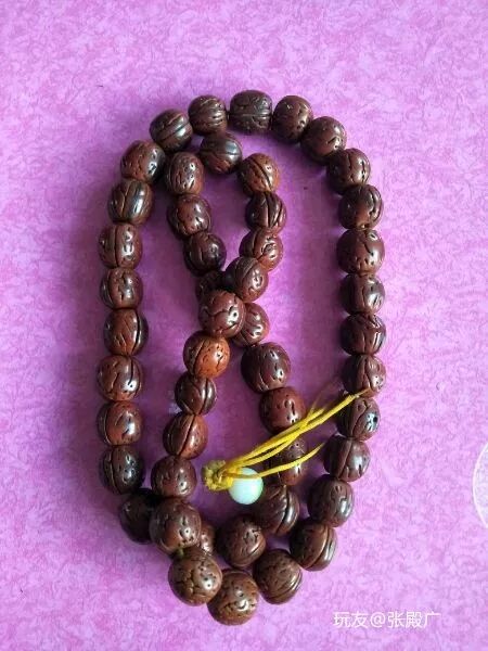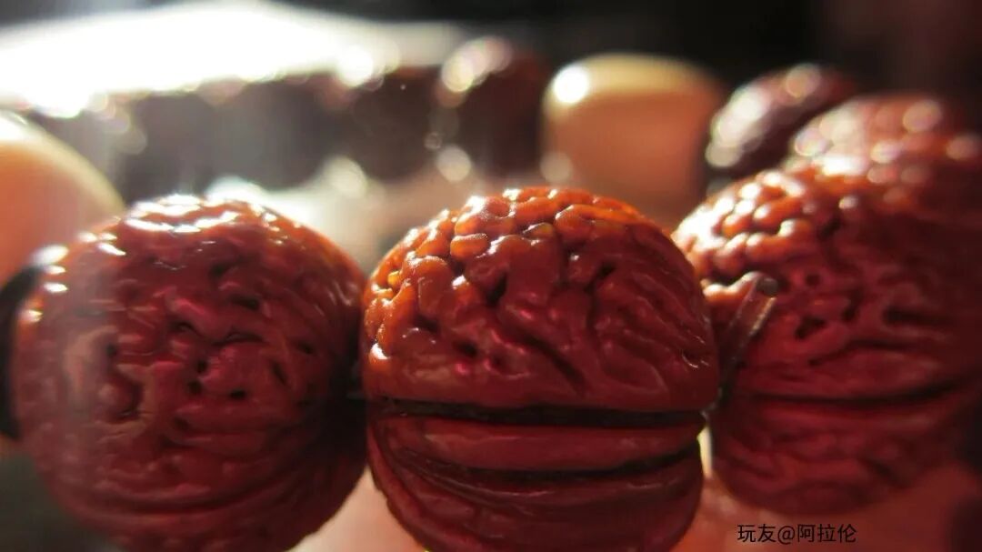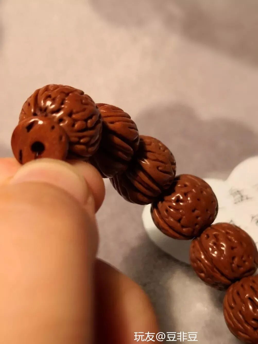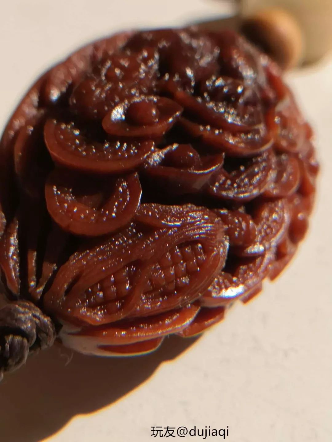 桃核雕刻,是核雕技艺中的一种,与核桃、橄榄核等类似,核大壁厚的适合雕刻。玩家DIY或是名家雕刻,都能在小小桃核上雕出花儿来。简单的,雕花,复杂点的,雕画。玩友@dujiaqi 曾用油盘过的桃核雕刻。据说这枚桃核核雕是潍坊的一位老师傅雕刻的,已经玩了十年,不但包浆红润浓郁,而且很多地方都已经开始玉化了。蟠桃核、碧桃核、脑纹桃核、龙纹桃核等纹路的桃核,啃劲果肉剩下的果核,打孔穿籽,自成一条手串。因着桃核的辟邪保平安寓意,有些老辈人就地取材,没有菩提籽的年代就开始盘国产的桃核手串了。玩友@张殿广 有条桃核手串,别人出价三千,他没卖。“这是家里老人盘了20多年的桃核,父亲一生学佛,二十多年前自己在家桃树下边捡了49个桃核,用热铁丝穿眼,穿成串。当时老人没有挑,因为本意只是用来计数的,所以桃核都不是很圆。”老爷子念一句拨一下,念了十五年,后来老人走了,就传给了下一代,留着是个念想,多少也不卖。近两年,桃核手串从小众突围出来,成为去年最流行的一款文玩。桃核手串可不是好伺候的主儿,难盘。![]()