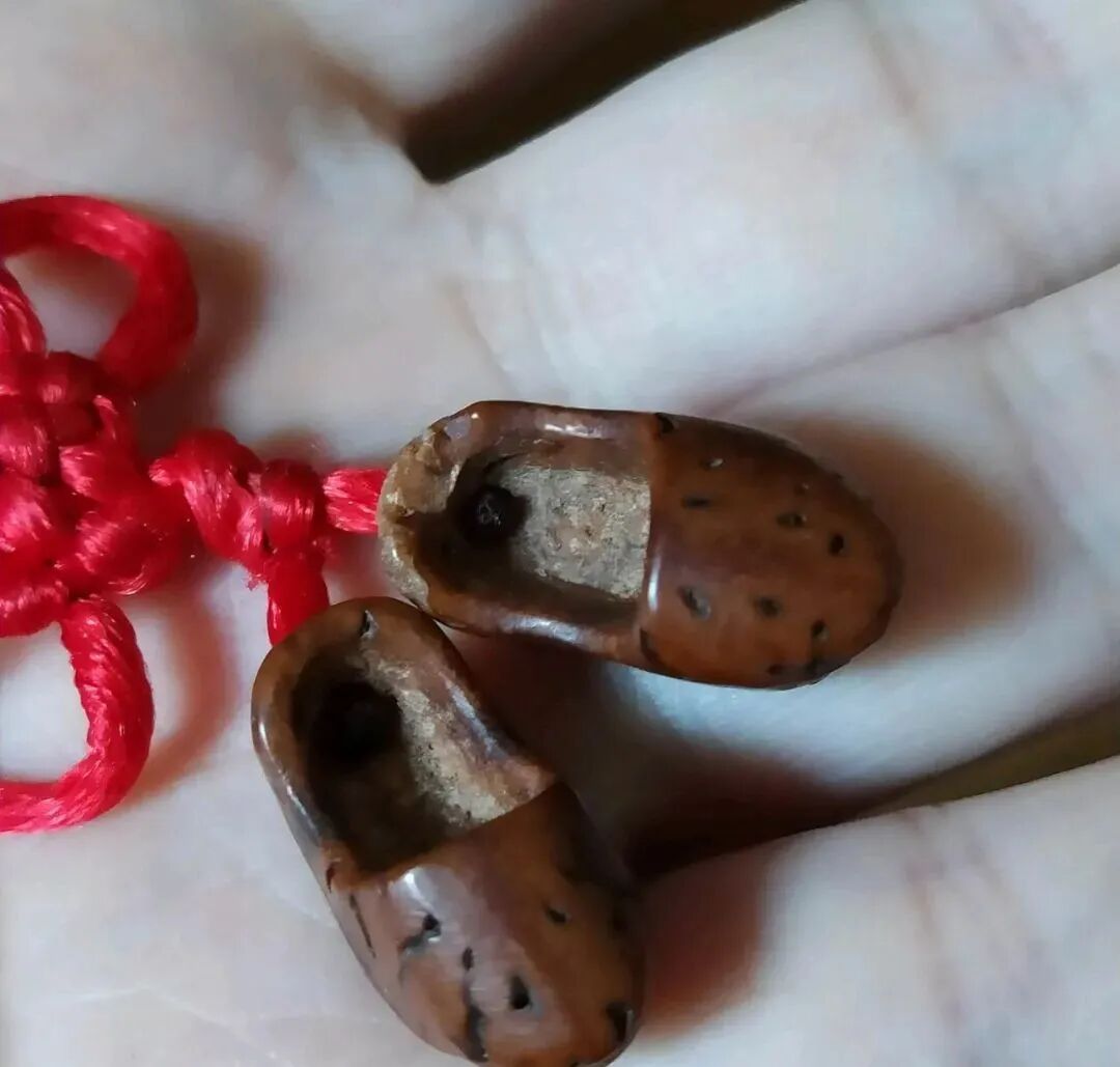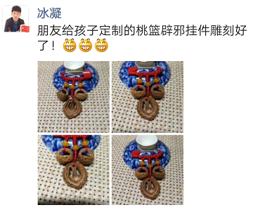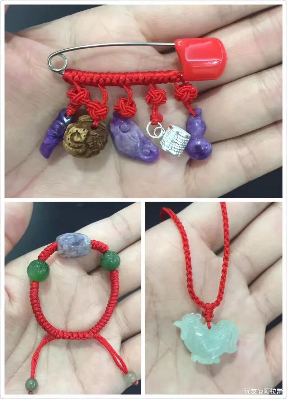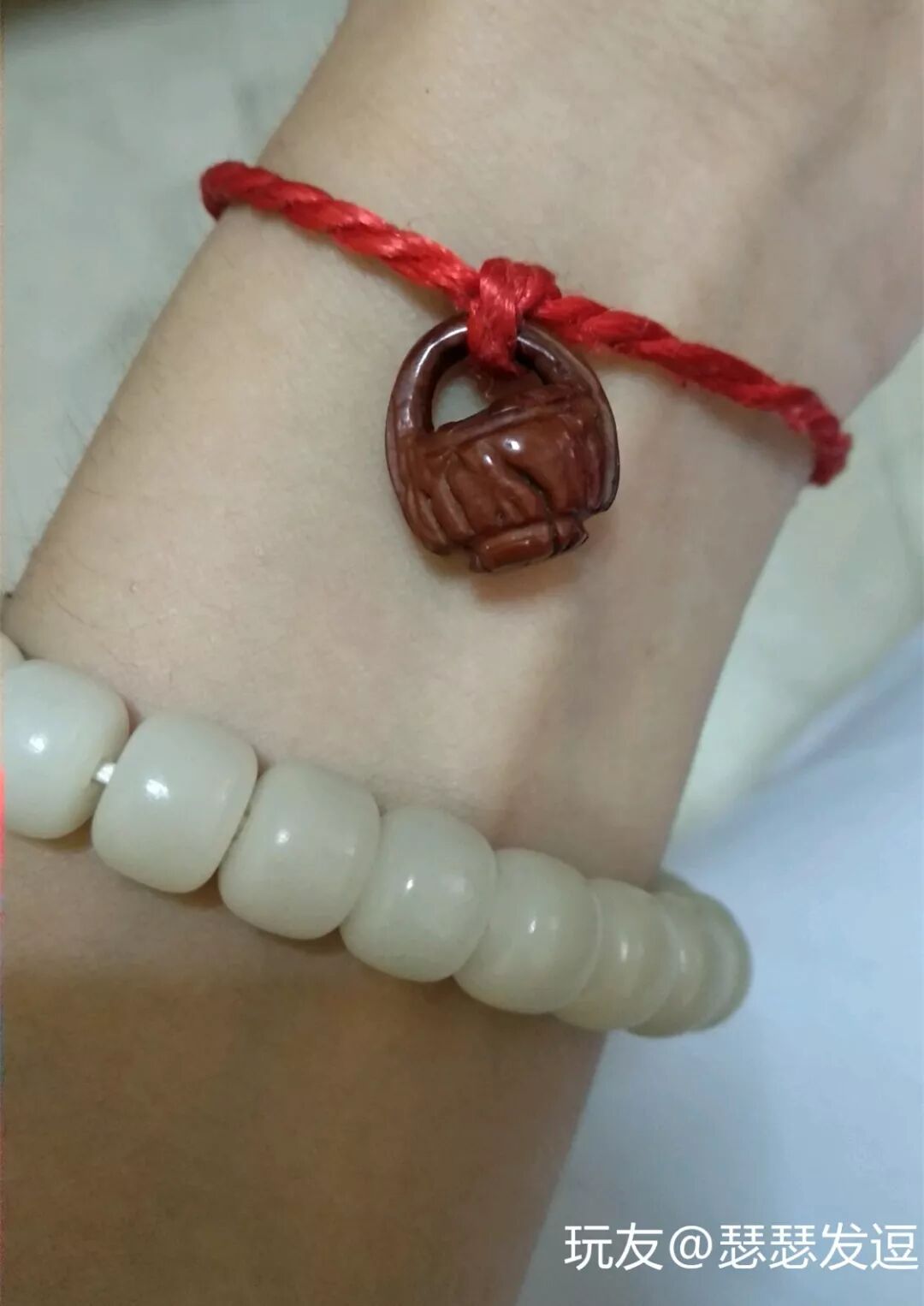 桃篮辟邪挂件,是长辈为小宝宝准备的礼物。有些地方有讲究,说这红色别针挂坠从孩子一出生就要别在衣服上,一岁以内戴着辟邪。之前,玩友@阿拉蕾 也提前为宝宝准备了一份特殊的礼物。红色别针上,依次挂着舒俱来竹节(上面雕刻着蝙蝠)、桃木如意、舒俱来如意、银针箍和葫芦。竹节、桃木、如意、葫芦,每一样都有着平安如意、福禄双全的美好寓意。如果说红色别针不常见,但桃核雕刻手链,很多人不陌生吧?不拘什么款型、什么纹路的桃核,老一辈人的朴素愿望寄托在一枚做工不那么细腻的桃篮上,甚至是打孔的整颗桃核吊坠,简单却又真挚。还有人从小戴到大的是桃核做的鞋子,寓意和谐(核鞋),用中国结作结,是辟保平安的意思。自古,贵族阶层会选择玉如意等辟邪招吉祥的物件,而桃核,是平头百姓最常见的辟邪之选了。玩友@山里人 的父亲也有一个挂在钥匙扣上的桃核篮子,或许就是小时候父亲的长辈送他的,后来被挂在钥匙扣上许多年。从这厚重的泥垢可以看出,这枚桃篮起码有十多年的历史了。不论何时,长辈的小小心思,总是包含着对孩子满满的爱。到了文玩人这里,桃核还可以搭配配饰,组合成颜色亮丽的挂坠。![]()
