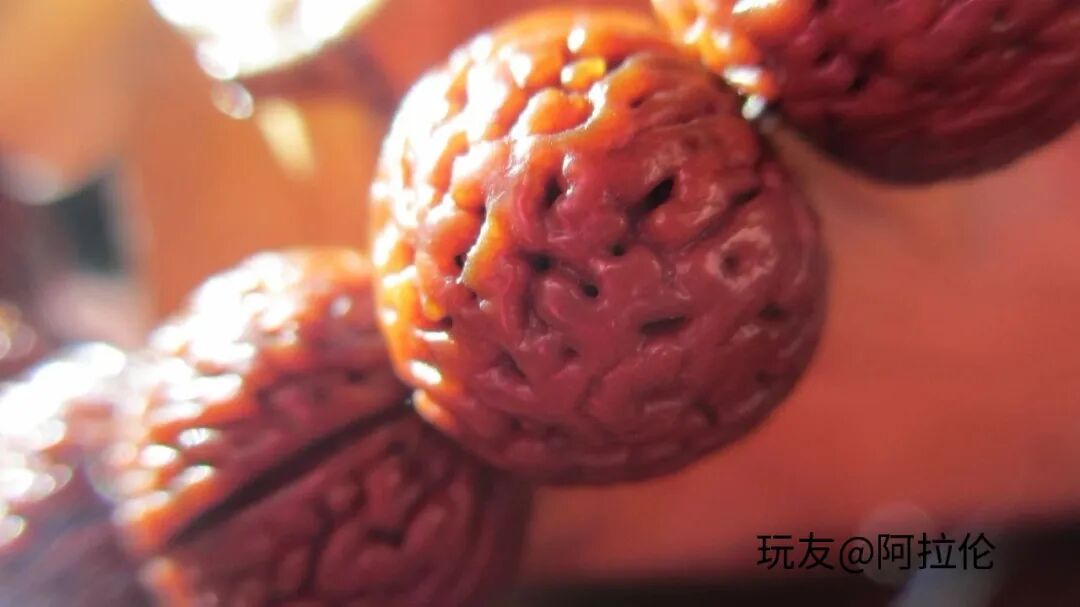 想把一条桃核手串盘到包浆,没有三五年的功夫是不容易的。玩友@阿拉伦 的这串脑纹桃核到手里,已经有接近五年的时间了。玩友@198713zn 的这条桃核手串也有近6年时间。