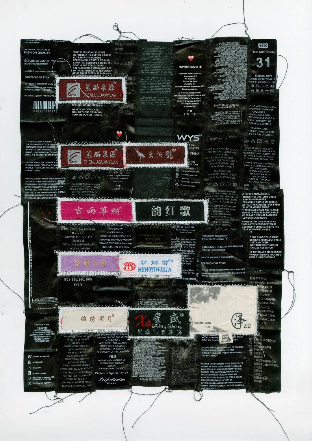 继续深入,是艺术徐冰为此次展览专门创作的《小民七言集:俏丽缘》,这是一部由服装标签组合成的诗集,共包含12首诗。