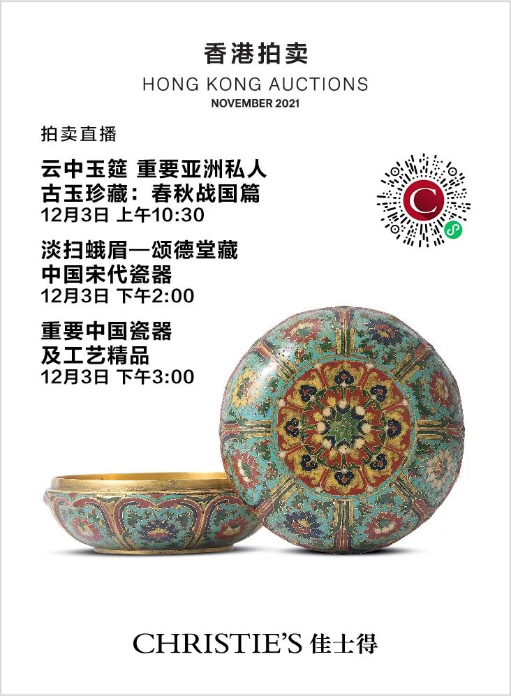 12月3日,佳士得香港中国瓷器及艺术品部将于香港会议展览中心隆重举行三场现场拍卖,包括“淡扫蛾眉—颂德堂藏中国宋代瓷器” 及“云中玉筵:重要亚洲私人古玉收藏—春秋战国篇”两场专题拍卖,连同每季焦点之 “重要中国瓷器及工艺精品” 拍卖,为一众藏家及艺术爱好者带来珍若拱璧的重要珍藏。本篇将引领各位欣赏数件重点拍品。