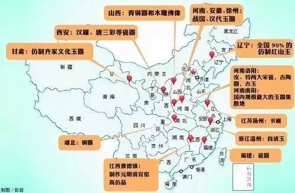 陶瓷造假重灾区:以江西景德镇、河南(洛阳孟津南石山村、禹县神垕镇、宝丰县)、福建龙泉地区、广东潮州等地为重;