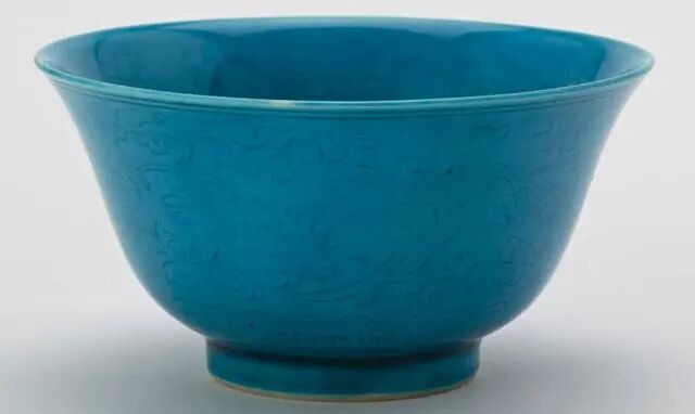 还有衍生品种,如孔雀绿地青花,孔雀绿素三彩,孔雀绿地五彩等。之所以命名为孔雀绿或孔雀蓝,是因为这种颜色极其类似于蓝孔雀或绿孔雀羽毛的颜色。所以一出世就被这么称呼。孔雀蓝又称“法(琺)綠釉”“法(琺)翠釉”“翡翠釉”“吉翠釉”等,是一种以氧化銅(CuO)作着色剂、以硝酸鉀(KNO3)作助溶剂的蓝绿色调色釉。有两种方法烧成。一种是在已经高温烧成的素胎毛坯上再涂上孔雀绿,入窑二次中温烧成。这种技法由于温度不够高,胎釉结合不好,时间久了容易造成胎釉分离,剥落。元代磁州窑的孔雀绿地黑花瓷器,其实就是因为这个原因多造成脱釉。第二种技法是在高温烧成素白瓷胎上上釉入窑低温烧成。由于有一层透明白釉成分和孔雀绿釉可以较好的结合,所以相对而言比第一种方法效果好,和后世其他品种的低温色釉如黄釉的做法比较接近。![]()