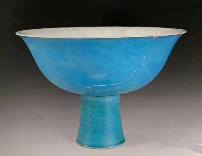 孔雀蓝辨识很明显,但孔雀绿和瓜皮绿则差异较小。一般来说,明代孔雀釉以蓝色居多,宋元时期则绿色居多,不过不管什么发色,本质上都是一样的釉。有民间传说柴窑就是孔雀蓝色,也就是所谓天青色,但目前未见到科学考古发掘之实物,暂时不予评说。![]()