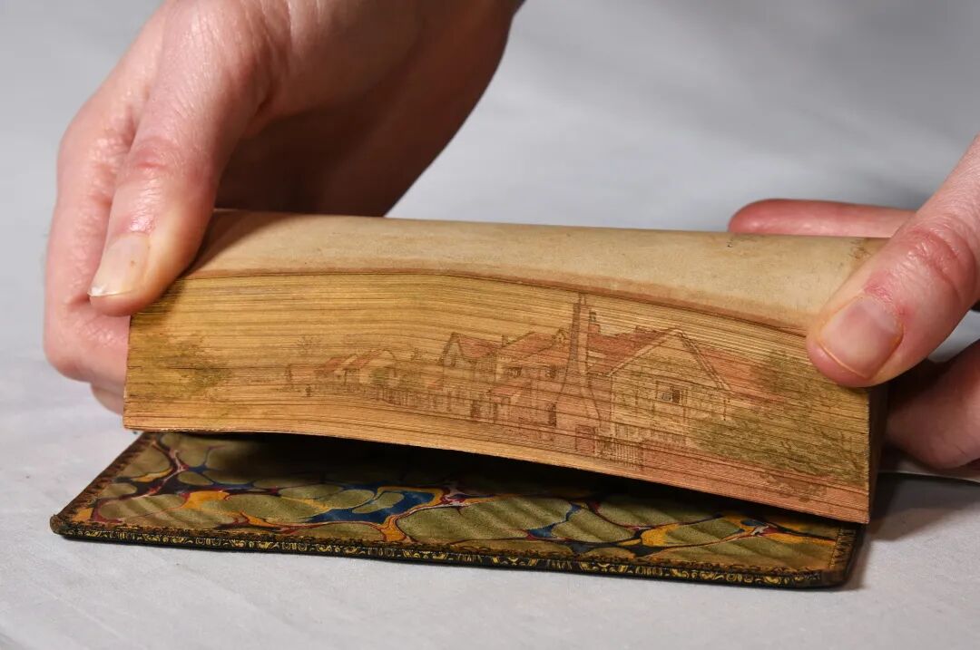 书口画,英文名称为fore-edge painting,译名也有书口彩绘,另有译名为“书边印图”“书口插绘”“书口绘饰”。所谓书口画,简言之,即在闭合或是扇形展开的书口上饰画的水彩画。有时候,会在书口上再进行“烫金”(gilding)或“大理石纹”(marbling)装饰,这样只有在书口以扇形展开时,书口画才可见。