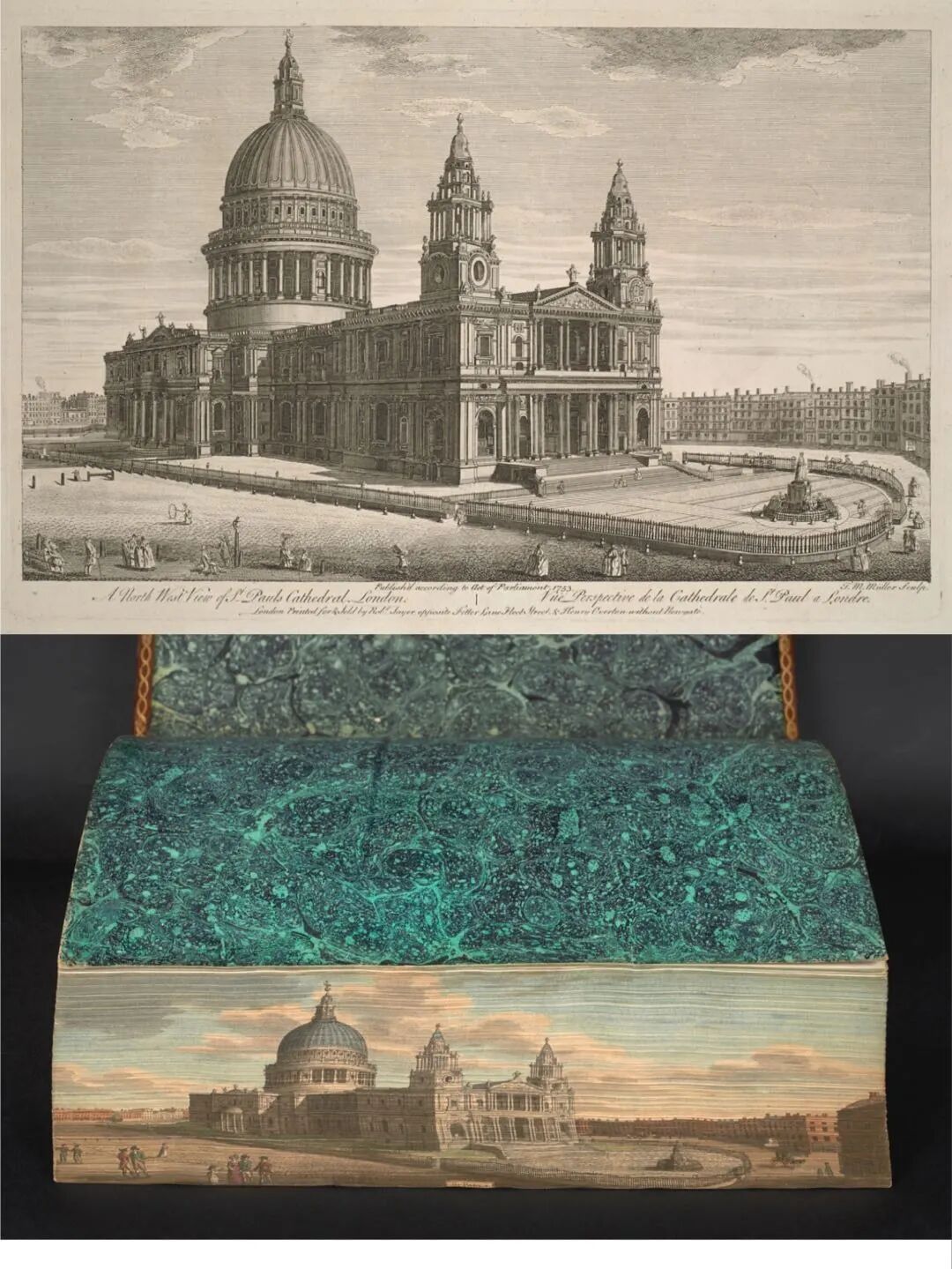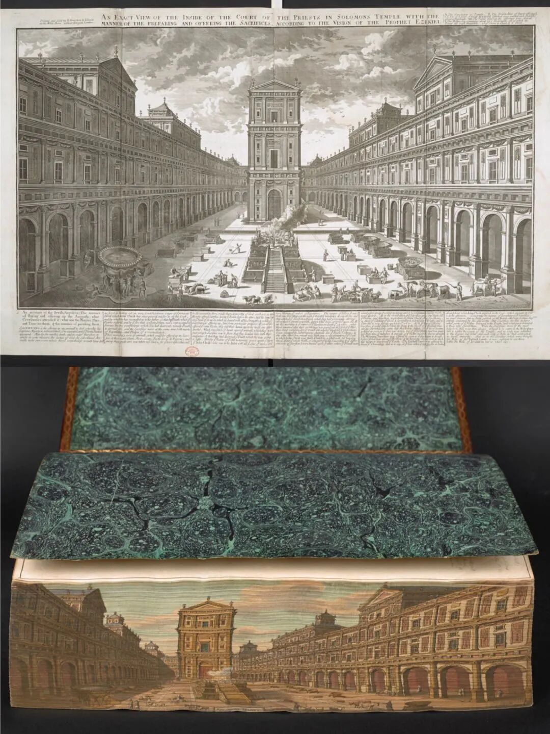 有个手记写在该圣经上,内容应是约翰逊写给弗莱的创作指示,“书口上要画所罗门圣殿和圣保罗大教堂”(见图6、图7),还有手绘的线描图,画着阿利礼堂和教堂,绿树环绕,这与最终的书口画内容一致。为此番工作任务,弗莱亲身去做这些准备性绘图不太可能。最可能的是,他演绎约翰逊的简易线描,然后根据现有地貌版画进行创作。爱丽斯·沃森还找到了弗莱进行书口画创作而参考的版画。