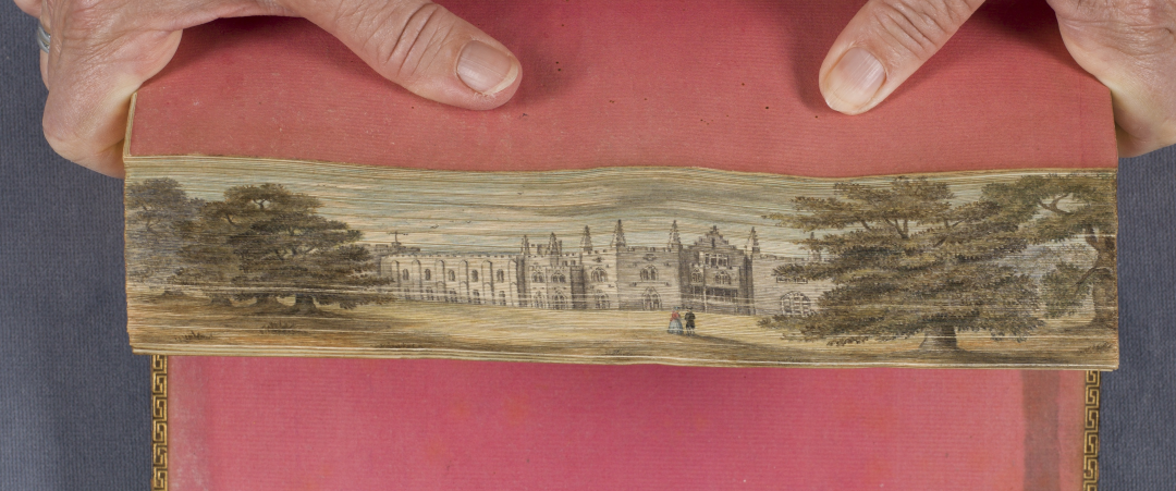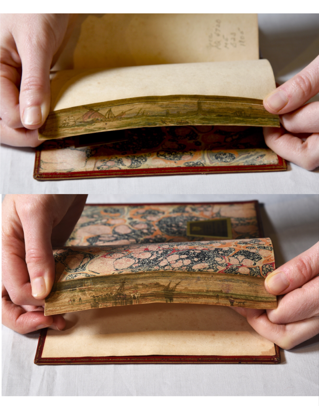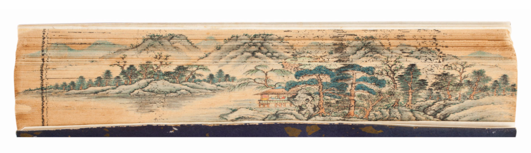 还有一本书有三面书口画的情况:三面书口画(triple fore-edge paintings),在双面书口画的基础上,不再以烫金或大理石纹隐藏,取而代之以第三面书口画。全景书口画(panoramic fore-edge paintings),即利用三个书口(书头、书根、前书口)创作连续的全景绘画(见图4)。